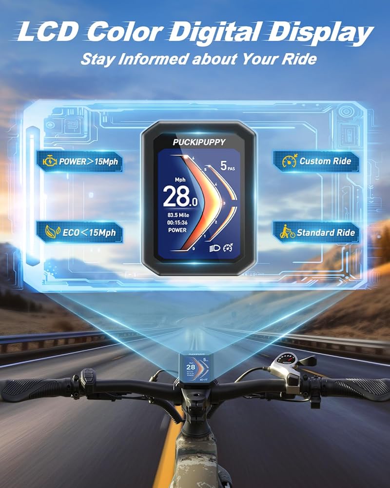 [960W Peak Powerful Motor] PUCKIPUPPY e bikes for adults electric features a 960W peak brushless motor, which deliver 90Nm torque and 35°Max climbing ability, up to 28MPH in pedal assist mode. With this motor, you can travel freely on mountain roads, city roads, sandy roads and snowy roads.