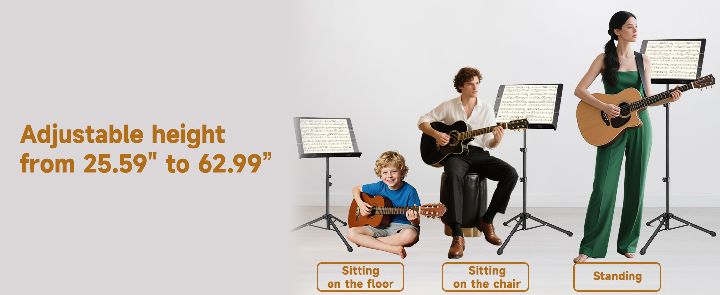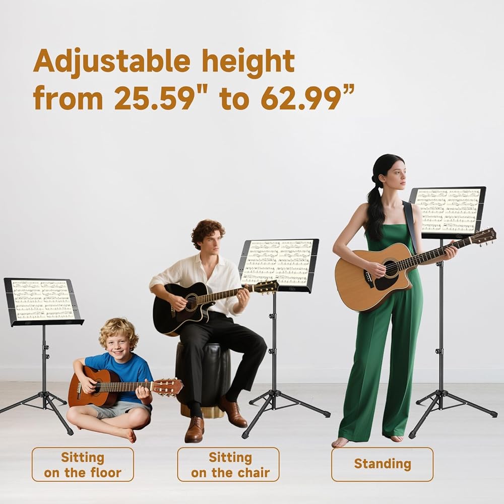 🎼【𝐀𝐃𝐉𝐔𝐒𝐓𝐀𝐁𝐋𝐄 𝐇𝐄𝐈𝐆𝐇𝐓 & 𝐓𝐈𝐋𝐓】- Height ranges from 25" to 63", suitable for sitting or standing. The atril para partituras features a 180-degree tiltable tray with a secure clip holder, ensuring sheet music stands firmly in place.