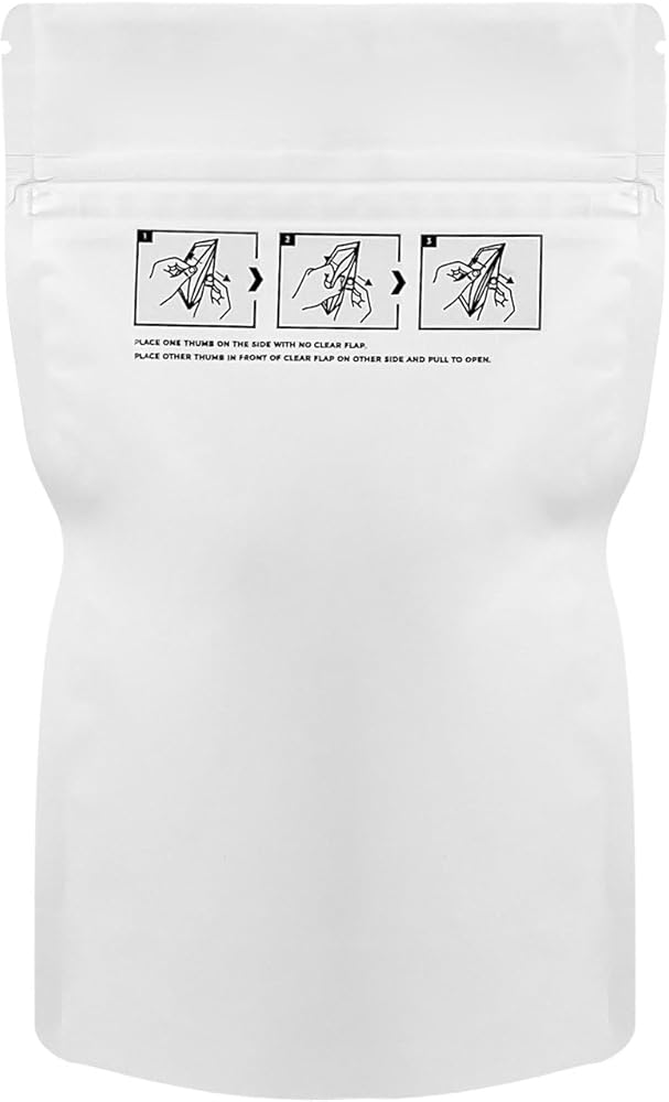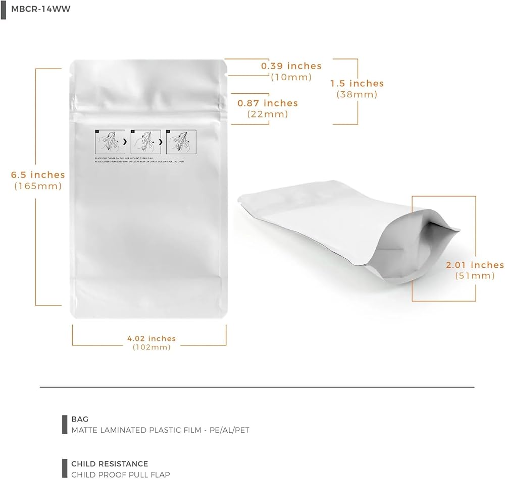 • MYLAR BAG: Child resistant food safe pouches made of Polyethylene (PET/PE). Childproof resealable zipper meets a heat sealable opening with an easy-to-open tear notch. The outside of this bag is opaque white, which allows plenty of room for branding with stickers, labels, or barcodes for processors, packagers, and retailers.