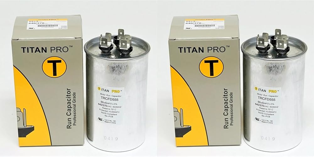 2 PACK Dimensions and Specifications: Diameter- 2.64 Height- 4.13 Add 1/2 inch to height for terminal length Round in shape There are 1/4" male terminals on the capacitor Rated at 55/5 MFD/uf 440/370 Volts 50/60HZ Features: Heat tolerant, tested up to 60,000 hours of run time Cans are made of high-grade metallized polypropylene film and proprietary Epoxidized Soybean Oil (ESO) Three tri-blade terminals (c, h, f) Rated to 158 Degrees (Fahrenheit), Protected to 10,000 AFC Meets UL 810 safety standards NON PCB Long Life Operation