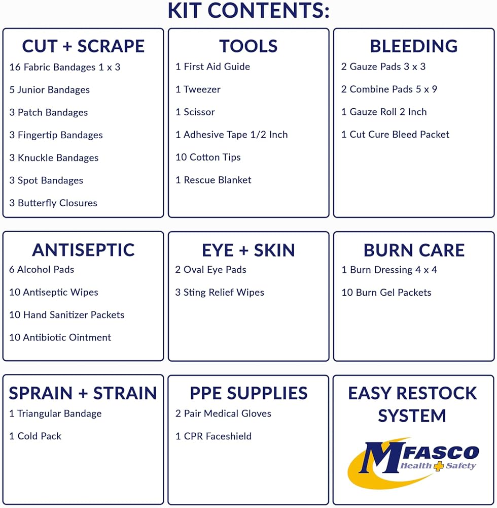 OSHA & ANSI COMPLIANT: Stay prepared with MFASCO's 2021 OSHA & ANSI Z308.1-2021 Compliant First Aid Kit. Designed for businesses, offices, and work sites, this kit ensures compliance with the latest standards for workplace safety. Assembled in USA.