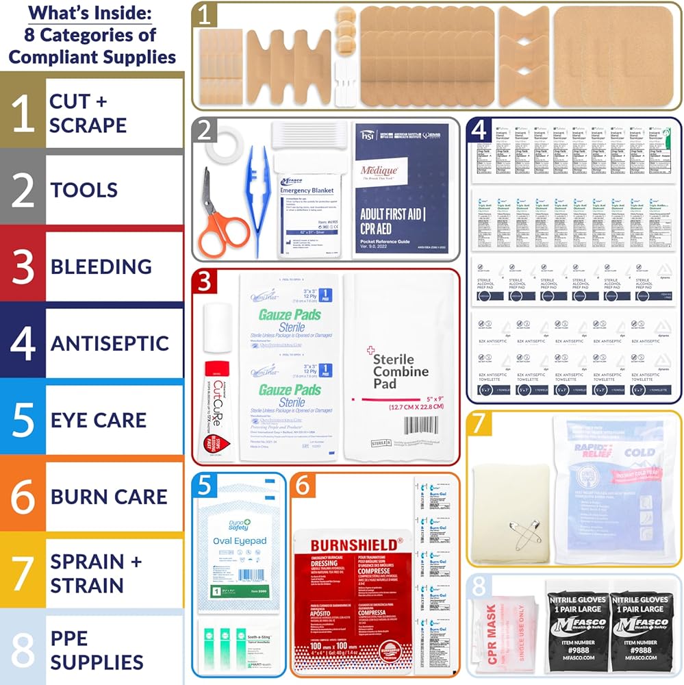 Meet our latest 2021 ANSI Z308.1-2021 & OSHA compliant first aid kit by MFASCO – built tough for tough jobs! Packed in a super-strong, waterproof case, this kit is perfect for places like construction sites or maintenance work. It has all the important stuff organized neatly, following the ANSI standards. It's sturdy but not heavy, and it can handle crazy temperatures from super cold to really hot. With easy-to-use black handles and a red case, it's not only safe but also easy to carry. It's the go-to safety buddy for businesses, offices, classrooms, and homes. Be smart, stay safe with MFASCO!