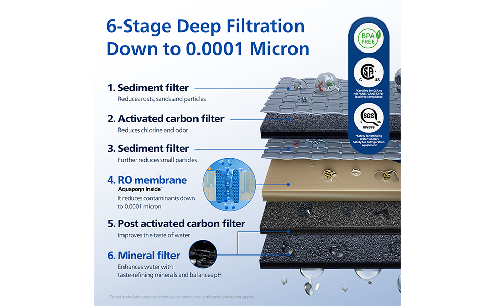 أكابورين داخل التناضح العكسي: تسخير قوة الطبيعة. يشتمل غشاء التناضح العكسي الحيوي على بروتينات أكابورين لتكرار عملية ترشيح المياه الخاصة وتخلف الماء بشكل أسرع وأفضل من أي وقت مضى. يمكن للمرشح إزالة المواد الضارة بشكل فعال إلى 0.0001 ميكرون. تم تطوير Aquaporin Inside RO Technology بواسطة Aquaporin A/S (الدنمارك) وتم اختباره بالتعاون مع ناسا و ESA لأنشطة الفضاء. الابتكار والأداء والمتانة