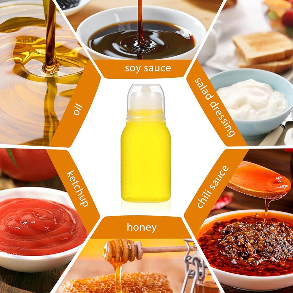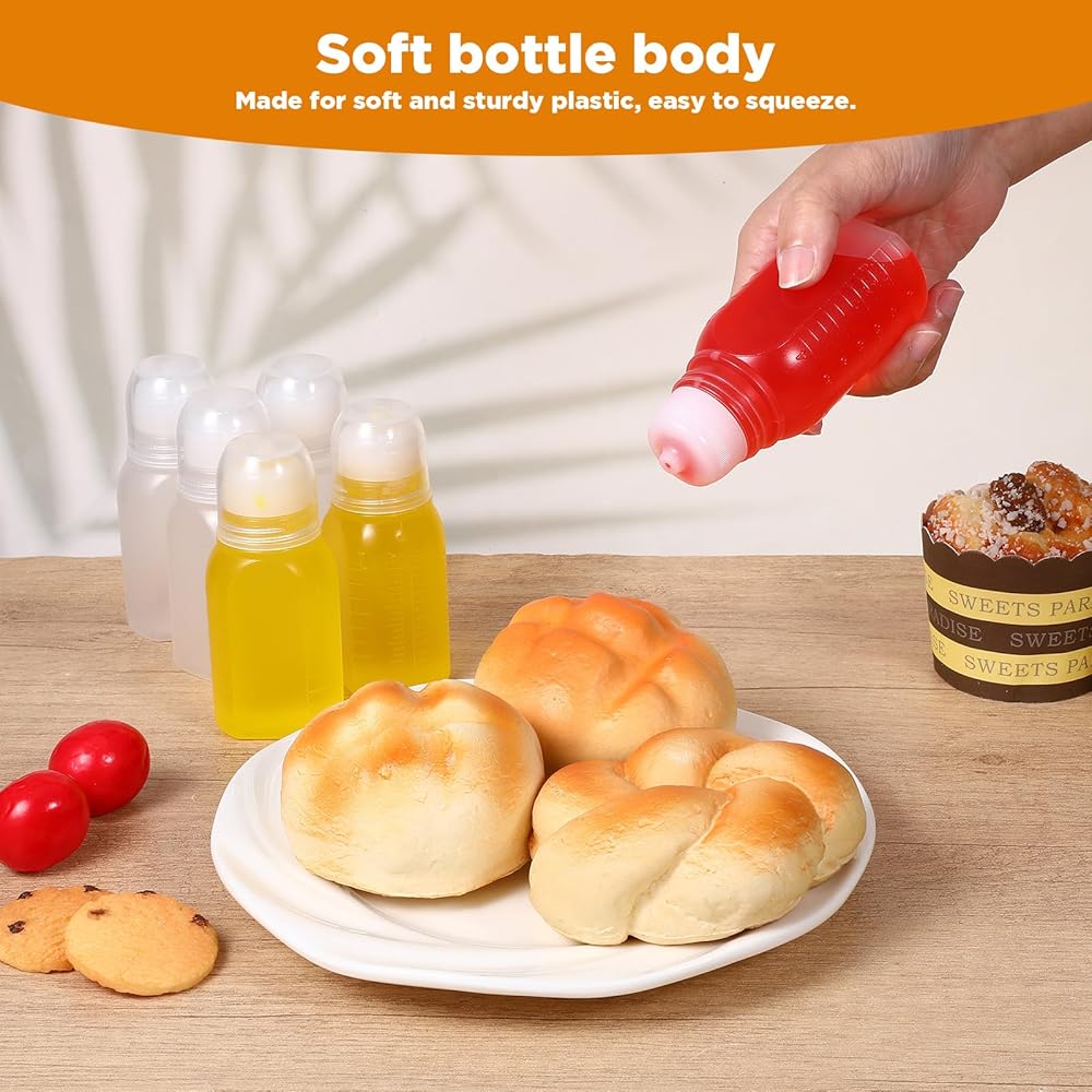 【Translucent Design】: The mini squeeze bottles for sauces feature a translucent material that allows you to easily see the contents and monitor the remaining quantity, making salad dressing bottles a practical choice for portion control.