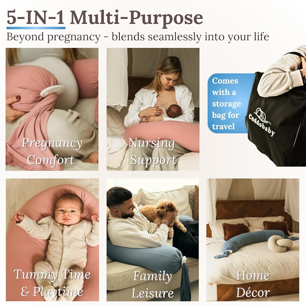 【5-IN-1 Versatile with Durability】Designed not only for pregnancy, this full body pillow caters to mama's needs from prenatal to postpartum, pregnancy comfort to breasfeeding support, and supports practicing tummy time and babytime with baby. Works as napping pillow on sofa and home decor piece, too. Unlike typical pregnancy pillows only lasting several months of use, this pillow is designed to be enjoyed by the whole family for a long time.