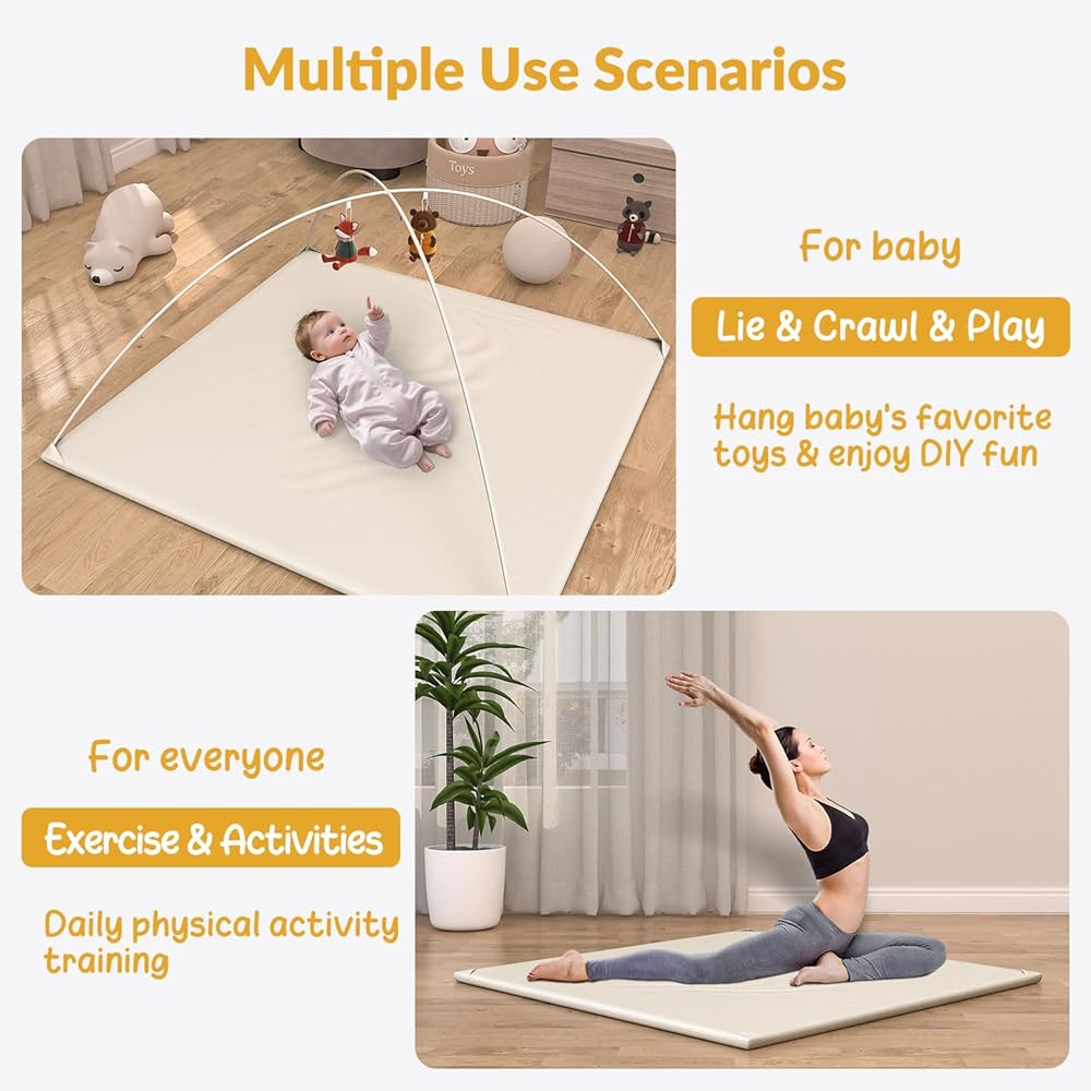 لعب الأطفال المبطن من الجلد الناعم الناعم النباتي مع حصيرة الرغوة الكثيفة سهلة المسح و 2 جوانب مقاومة للماء البطن وقت playmat تناسب 50 "x50" "، 2 دعم أعمدة لعبة الدعم.