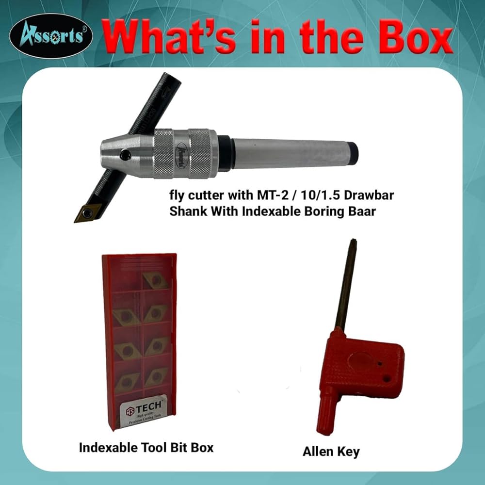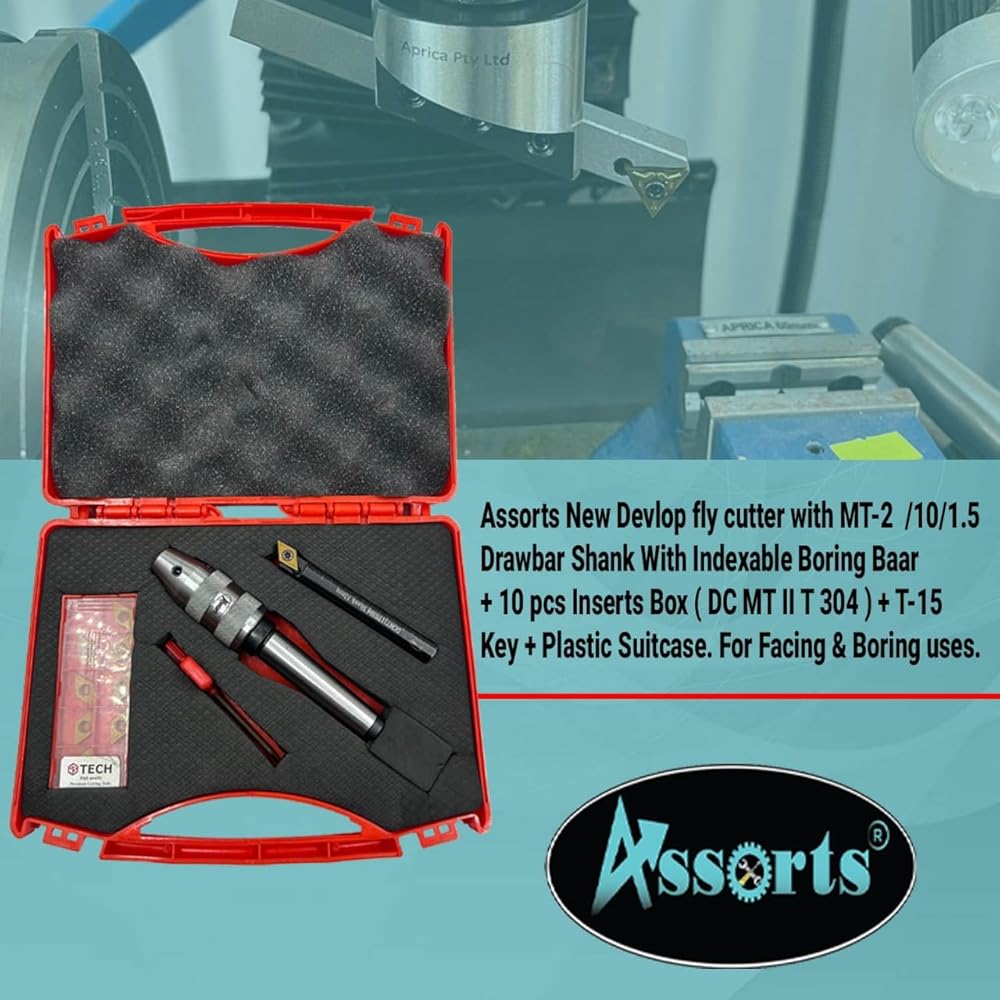 The Assorts New Developed Fly Cutter with 1/2" (12.7 mm) Straight Shank & Indexable Boring Bar is a high-precision tool engineered for facing and boring applications in milling and lathe machines. The universal straight shank ensures compatibility with various setups, making it a versatile addition to any machinist's toolkit. The indexable boring bar enhances efficiency by allowing quick insert replacements, reducing downtime and increasing productivity. This set includes 10 premium DCMT 11T304 carbide inserts, known for their sharp cutting edge, durability, and ability to handle various materials like steel, aluminum, and brass. The provided T-15 key enables effortless insert changes, ensuring smooth and continuous operations. For added convenience, the tool is housed in a sturdy plastic case with a foam lining, offering protection, easy storage, and portability. Designed for professionals, machinists, toolmakers, and hobbyists, this fly cutter provides superior surface finishes, minimal vibration, and high precision. Whether you're working on industrial projects or personal machining tasks, the Assorts Fly Cutter & Boring Bar Set ensures reliable performance, efficiency, and durability every time.