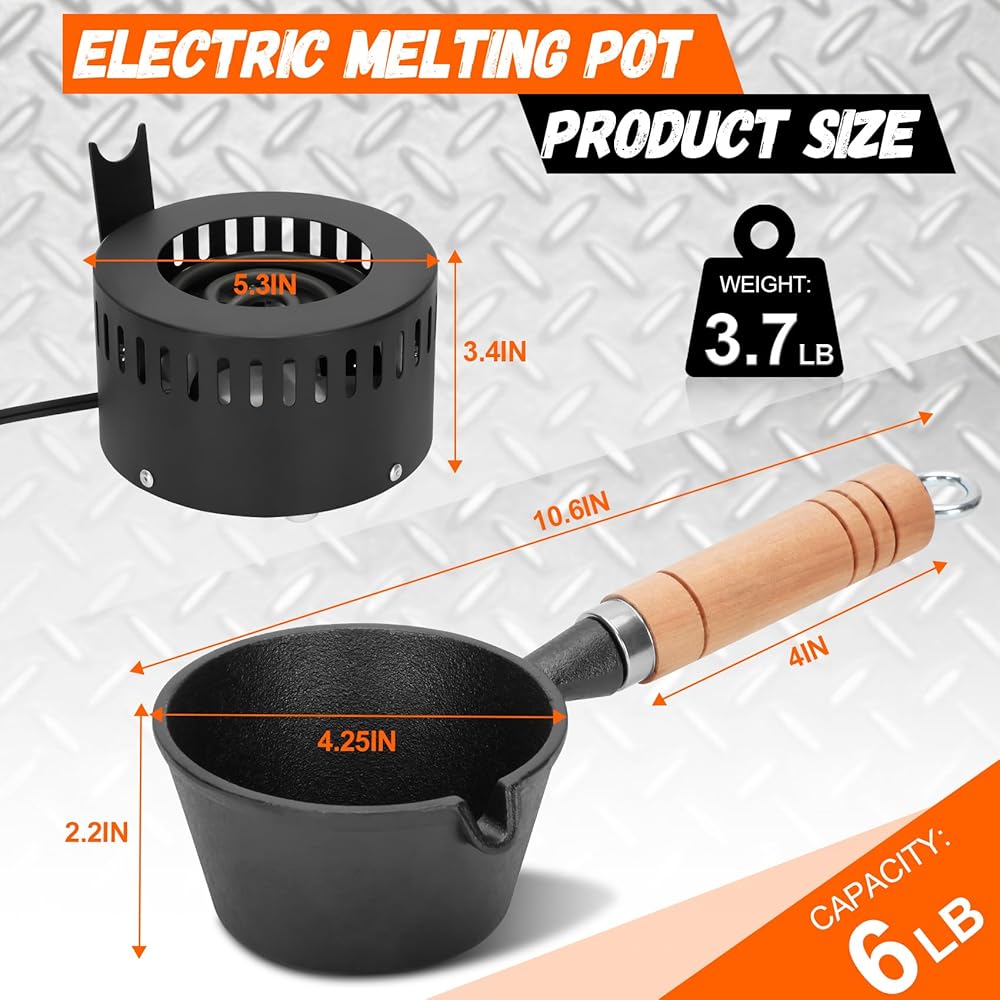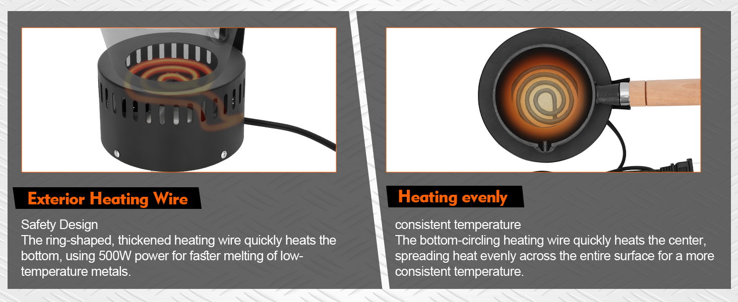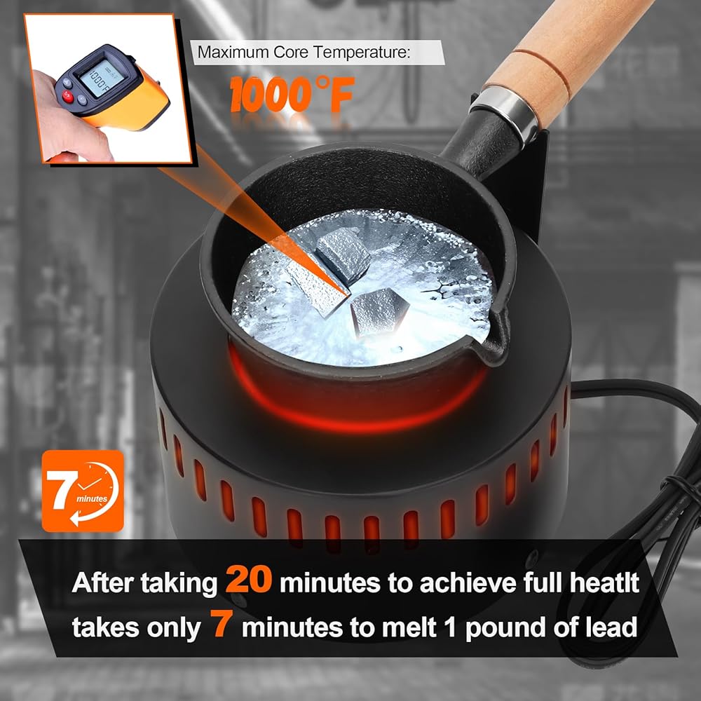ذوبان فعال: مصمم للكفاءة ، يذوب بوتقة ذوبان الرصاص دون جهد 15 رطلاً من سبائك الرصاص في 30 دقيقة فقط ، حيث بلغ متوسط 7 أرطال في الدقيقة ، وتوفير الوقت وزيادة الإنتاجية