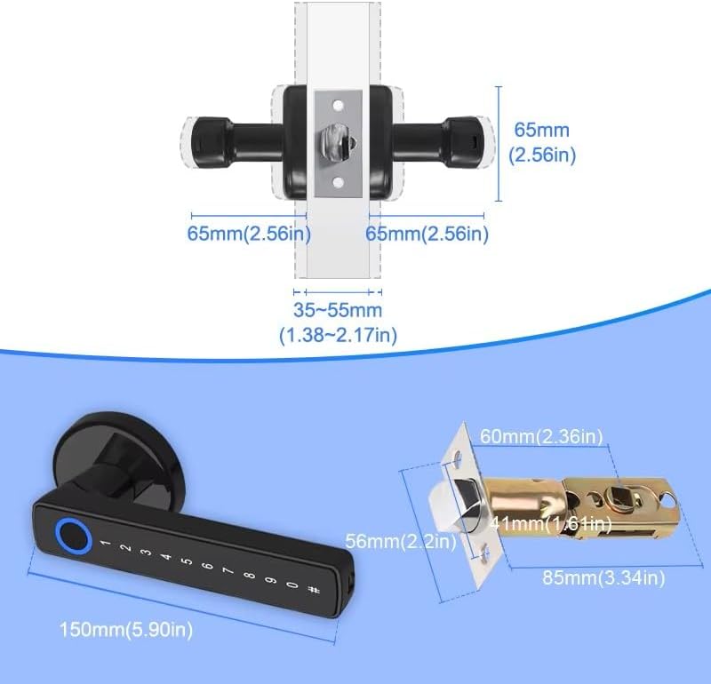 Smart Door Lock – Biometric Fingerprint & Keypad, Waterproof Deadbolt, Bluetooth App Control Upgrade your home security with this advanced smart door lock, designed for seamless keyless entry and maximum protection. Featuring five unlocking methods—fingerprint, keypad, Bluetooth app, IC card, and mechanical key—this lock ensures flexible access tailored to your needs. Sleek & Modern Design: Crafted with a premium matte black finish, this compact smart lock blends effortlessly with any door. Unlike bulky traditional locks, its streamlined rectangular shape maintains a minimalistic aesthetic while offering enhanced functionality. Fast & Secure Access: Equipped with an advanced fingerprint sensor, this lock grants access in under 0.3 seconds, ensuring quick and reliable entry. Through the Tuya app, you can manage user permissions, create temporary codes for guests, and monitor entry history—all from your smartphone. Durable & Weatherproof: Built with a robust zinc alloy body and an IP65 waterproof rating, this smart lock withstands various climates, making it ideal for homes, hotels, offices, and apartments. Easy Installation: Designed to fit most standard doors, this lock features an adjustable latch and a reversible handle for both left- and right-handed doors. Enjoy a hassle-free setup with step-by-step instructions.