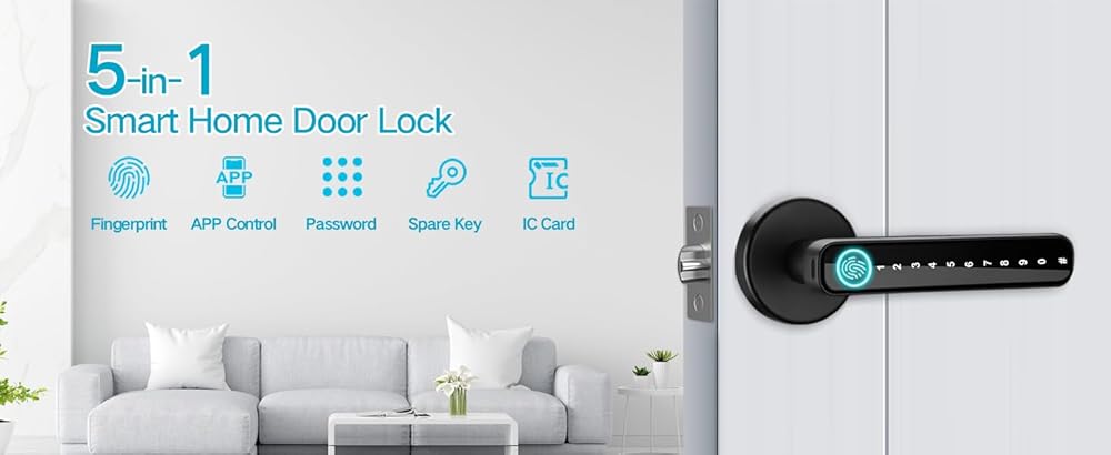 • 5-in-1 Keyless Entry Smart Lock – Unlock your door using fingerprint, touchscreen keypad, Bluetooth mobile app, IC card, or backup mechanical key. Perfect for front doors, rental properties, offices, and Airbnb setups requiring multi-access options.