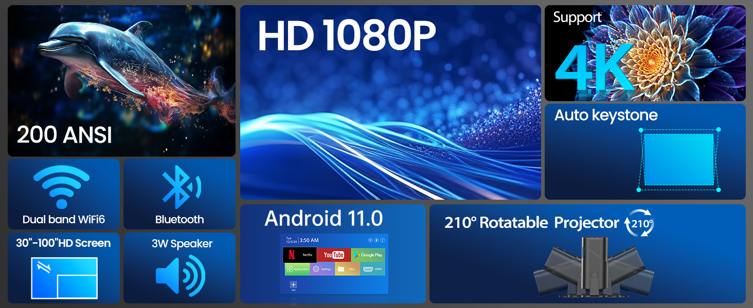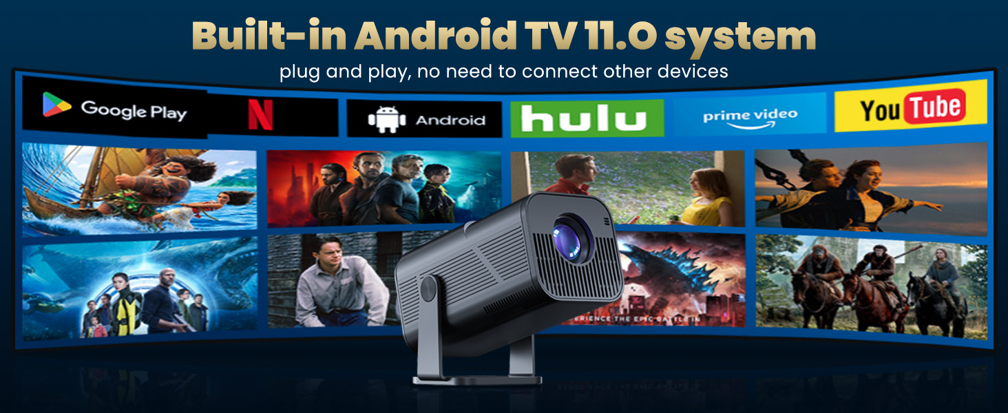 【Smart Projector with Android TV 11】Experience a world of entertainment with access to over 4,000 applications at your fingertips, including popular streaming platforms such as Netflix, Prime Video, YouTube, and more. Enjoy an extensive library comprising over 500,000 movies and TV shows. Our mini projector, equipped with Android 11, a Mali-G31 GPU, and WiFi 6 technology, ensures seamless connectivity and exceptional performance, providing a truly intelligent viewing experience