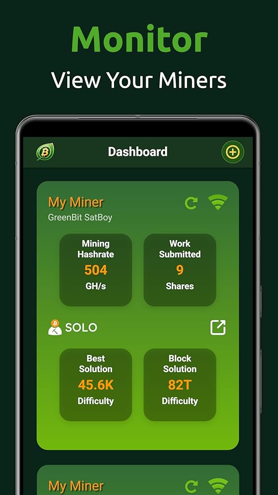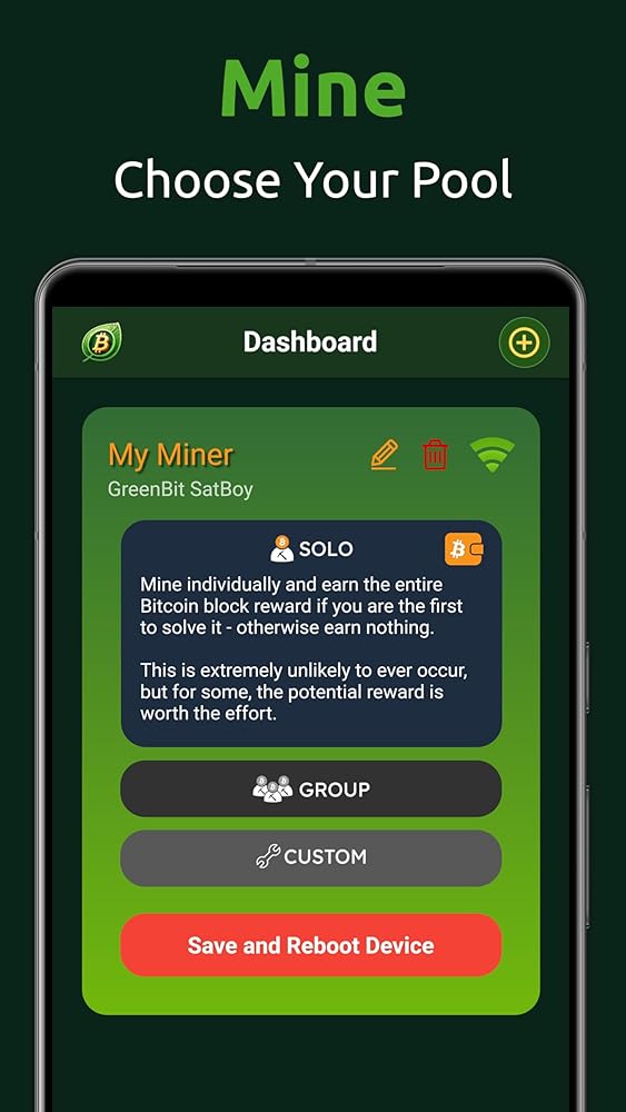 Introducing the GreenBit Satboy! Easily connect, configure, and monitor one or more GreenBit miners with the official companion app. Join a pre-configured mining pool using a compatible wallet address, or enter your own custom settings. Pool with other miners to continually receive your share of BTC, or test your luck mining solo for a chance at the full block reward! For help and support please contact [email protected]. Designed, developed and assembled in Australia.