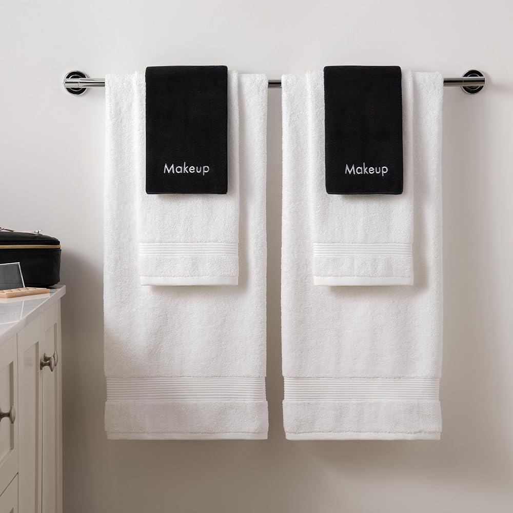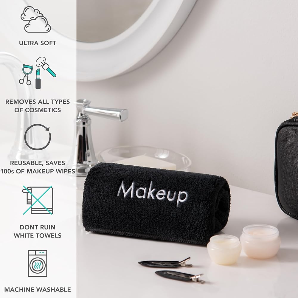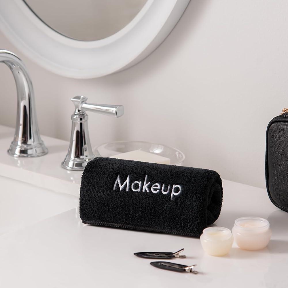 PRETTY MAKEUP REMOVAL CLOTHS: Elevate your cleansing experience with Arkwright Home's BCK2U Coral Fleece Black Microfiber Makeup Remover Washcloths beautifully decorated with a white sating piping edge printed with a repeat of the word “Makeup” in a sophisticated script font. Expertly designed for gentle skincare, these plush, 13”x13” cloths provide a gentle makeup removal experience. Each pack contains three premium-quality cloths, so you will always have one ready.
