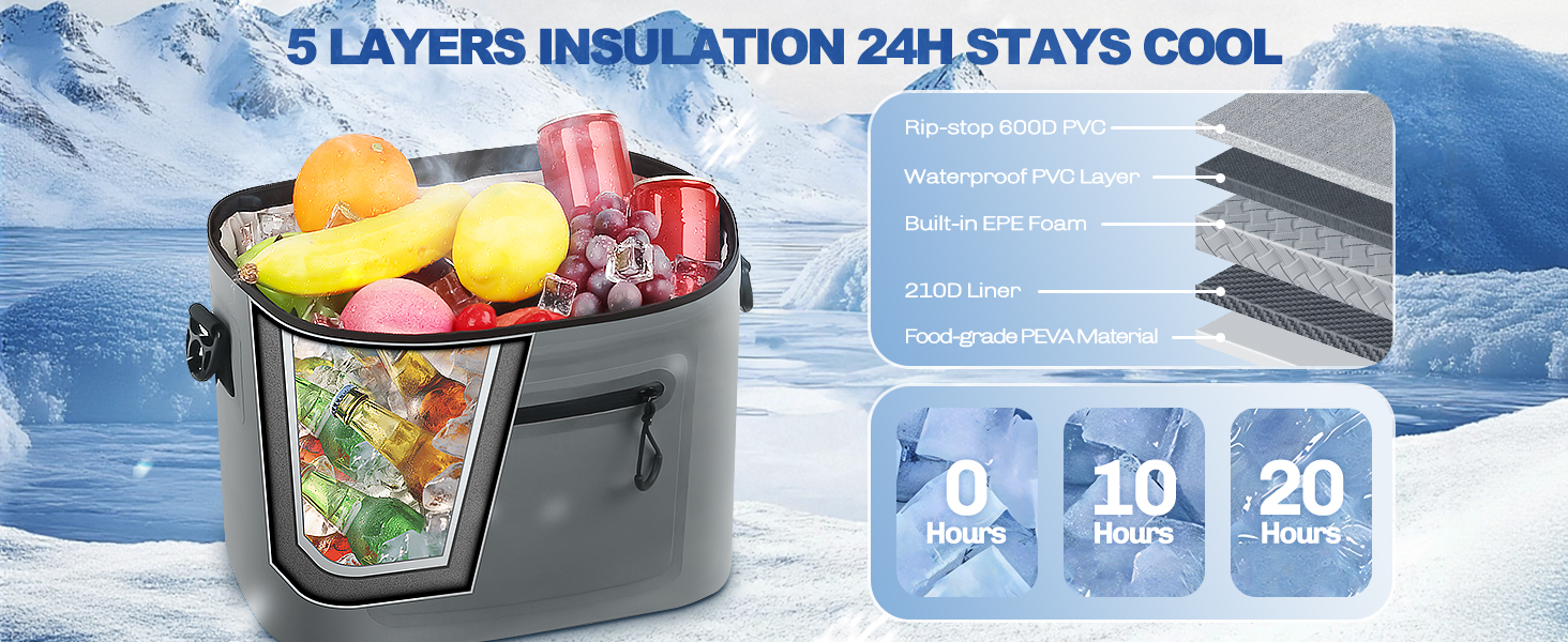 حقيبة برودة معزولة بنسبة 100 ٪-تتميز بيفا بنسبة بيفا بنسبة عالية من المواد التي يسهل تنظيفها. تم تصميم الجزء الخارجي من 600D PVC متين ، مما يوفر بناء قوي ومقاوم للدموع. لا مزيد من القلق بشأن التسريبات أو الانسكابات. بالإضافة إلى ذلك ، فإن المواد الناعمة والناعمة تجعل من السهل مسح البقع على سطح المبرد اليومي بمنشفة