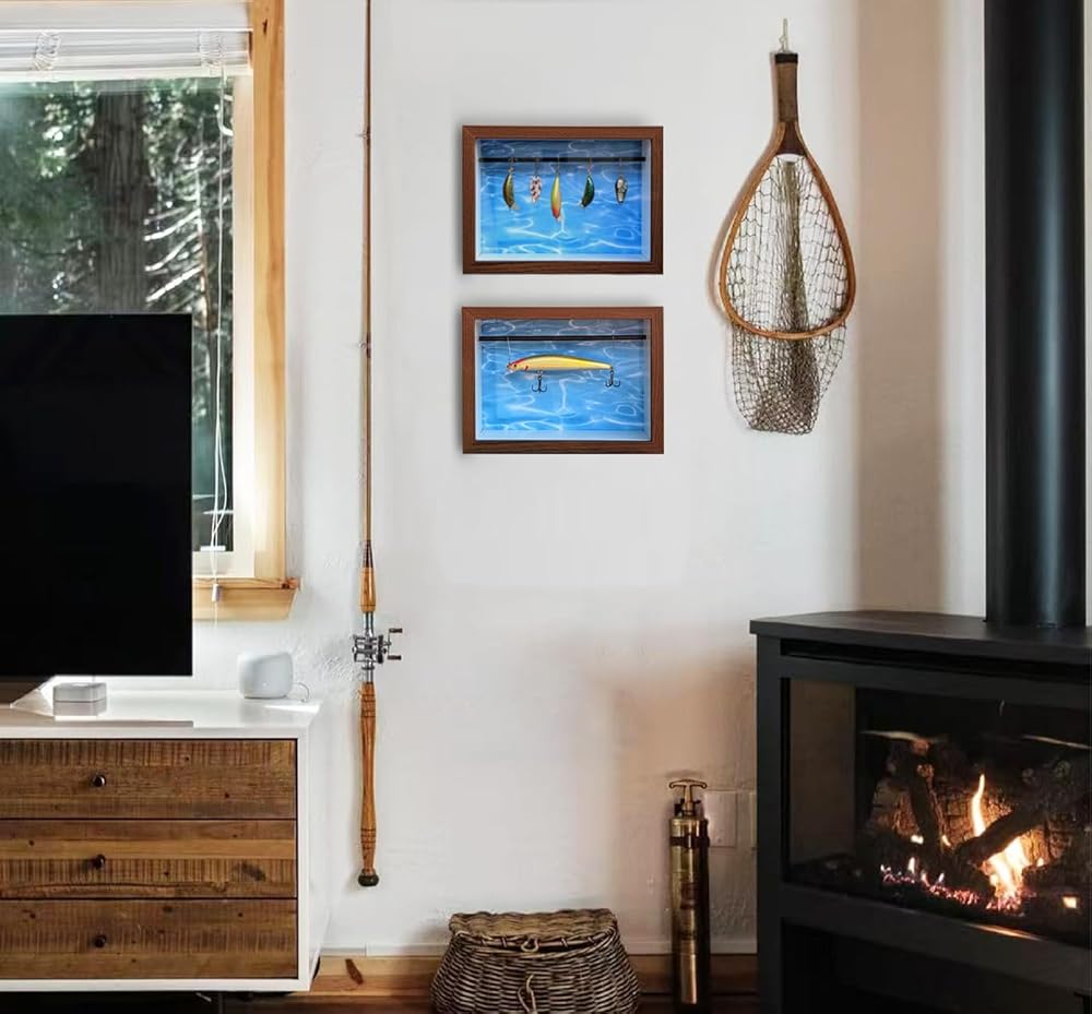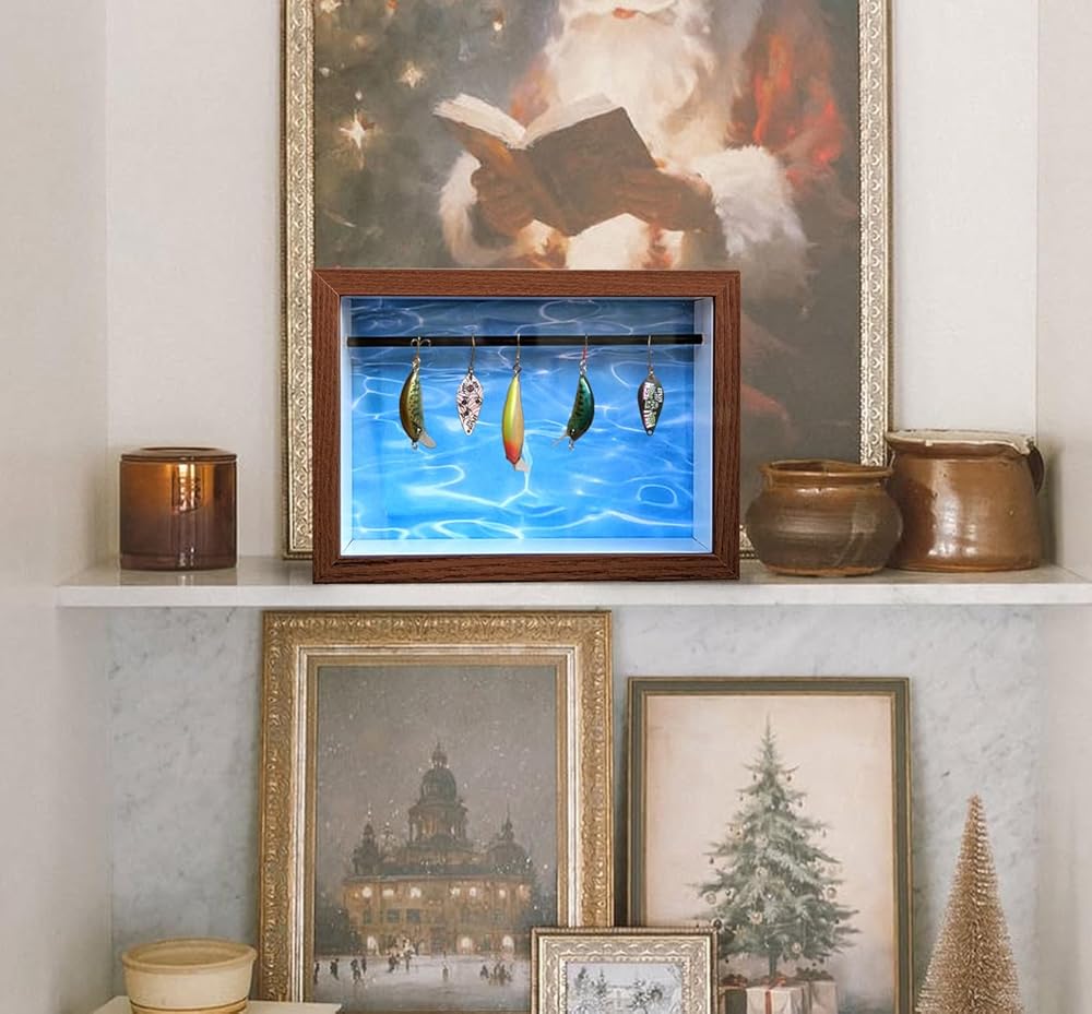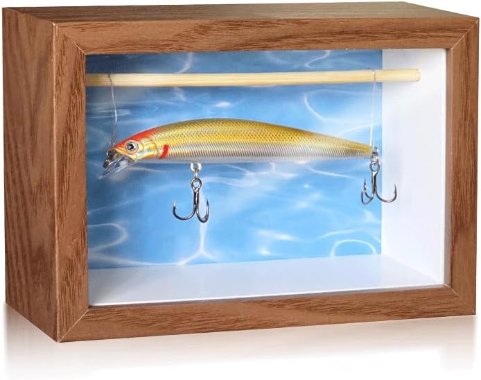 【Easy to install and versatile】: Tackle box to store your different size fish lures, ideal for storing most fish lures, hooks, bait boxes, swimbaits, small plugs, squid lures. the shadow box comes with a built-in holder that sits vertically, or can be hung on the wall using a serrated crochet on the back (Please note that fish lures are not included)