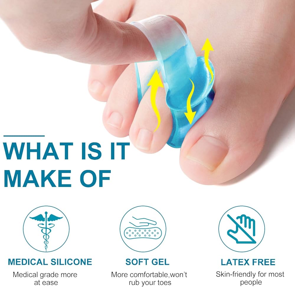 المواد: جودة عالية، مطاط، دائم وقابل لإعادة الاستخدام. مكواة فرد أصابع القدم الكبيرة مصنوعة من السيليكون وبطانة من الجل، ناعمة وخفيفة الوزن. تمنحك الراحة عند ارتدائها طوال اليوم مع الجوارب أو الأحذية.