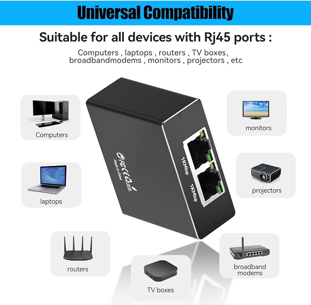 WIDE COMPATIBILITY: RJ45 8P8C LAN Internet Splitter Connection Extender is suitable for Cat8 Cat7 Cat6 Cat5 Cat5e network Ethernet cables, works with ADSL, hubs, switches, TVs, set-top boxes, routers, wireless devices, computers and more.