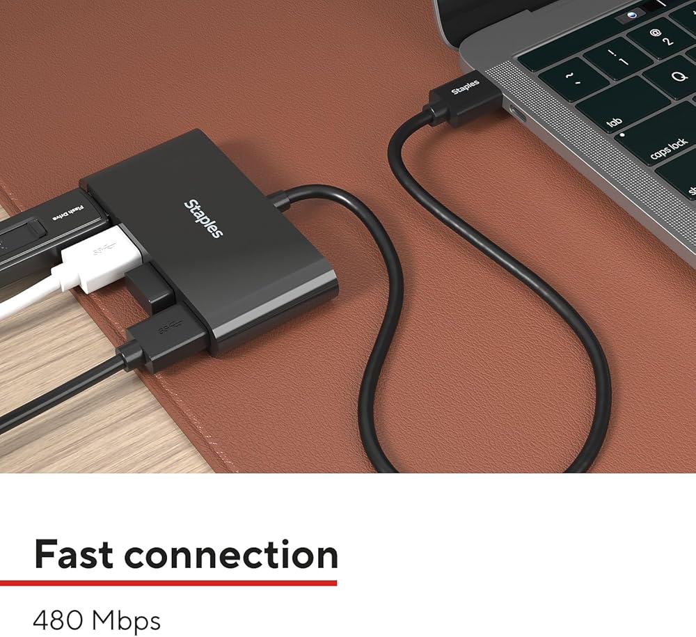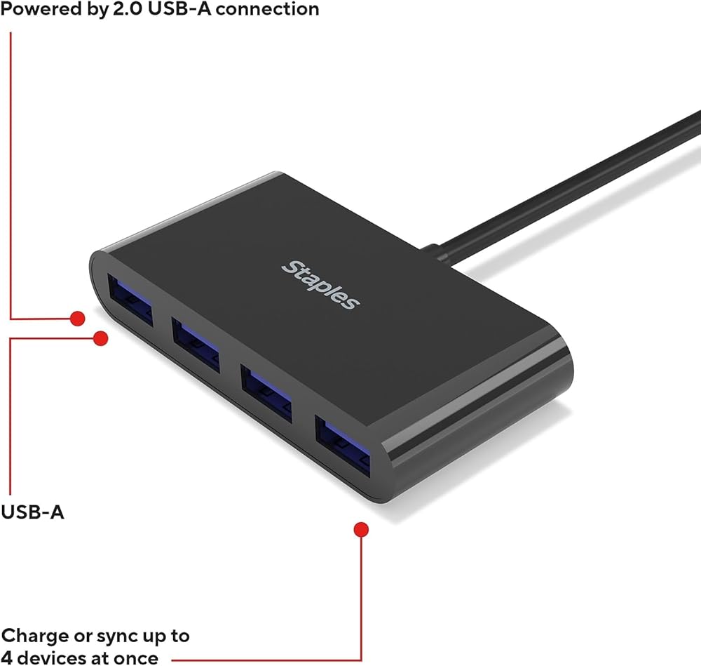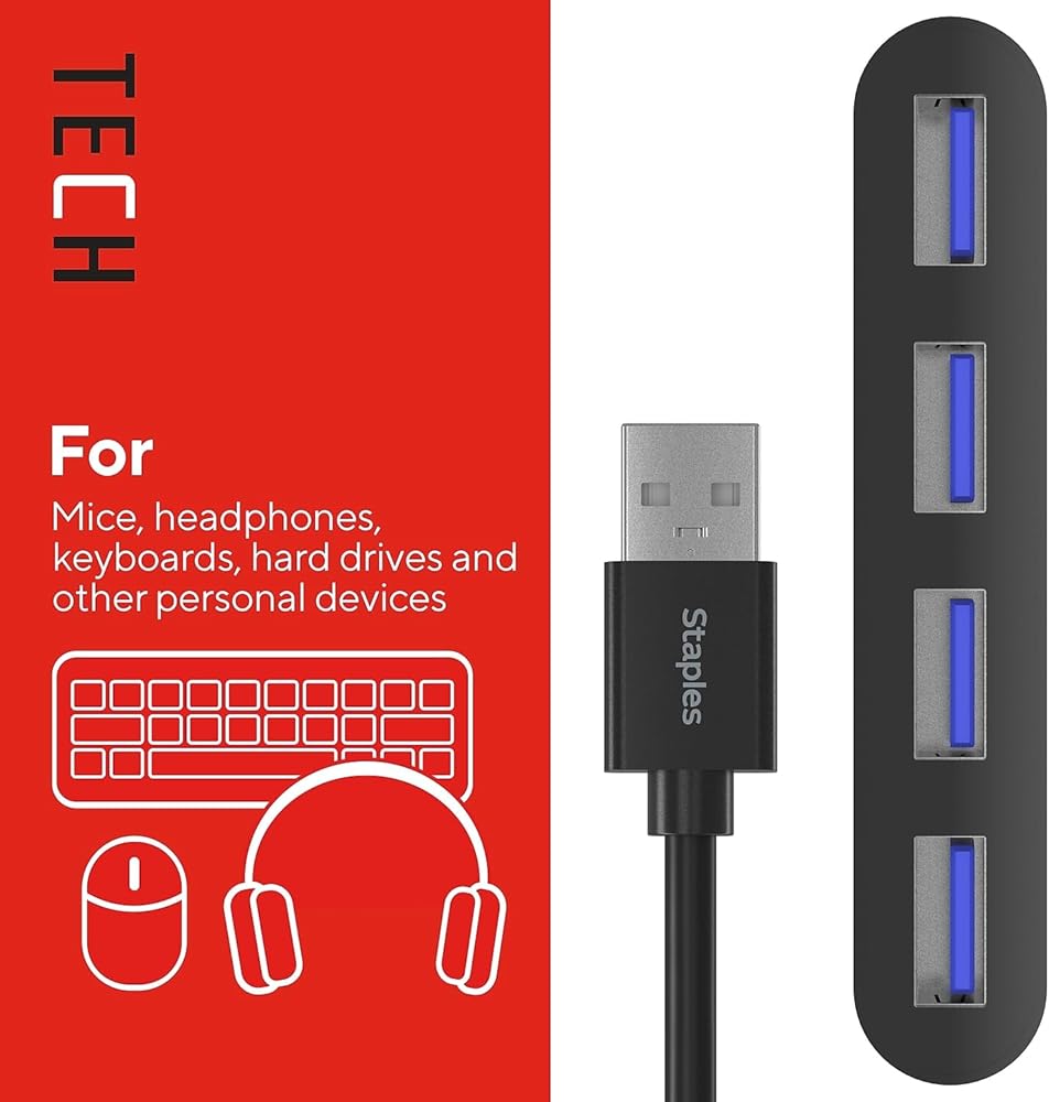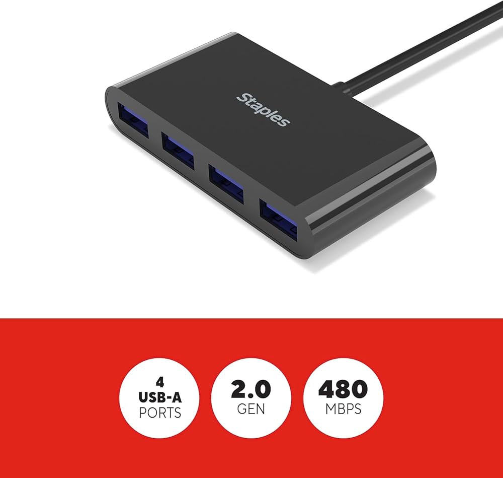 Connect up to four USB-A peripheral devices for a seamless work space at home, the office, or on-the-go. Never be without enough connection ports again. Connect USB-A peripheral devices - like mice, keyboards, headphones, and charging cords - for a completely connected workstation. Powered by USB 2.0, this hub promises fast data transfer speeds up to 480 Mbps. Measuring at just 3" x 5" this hub is compact and portable, perfect for on-the-go workers or smaller work spaces. Enjoy reliable and fast connectivity with the Staples TECH Four-Port Hub.