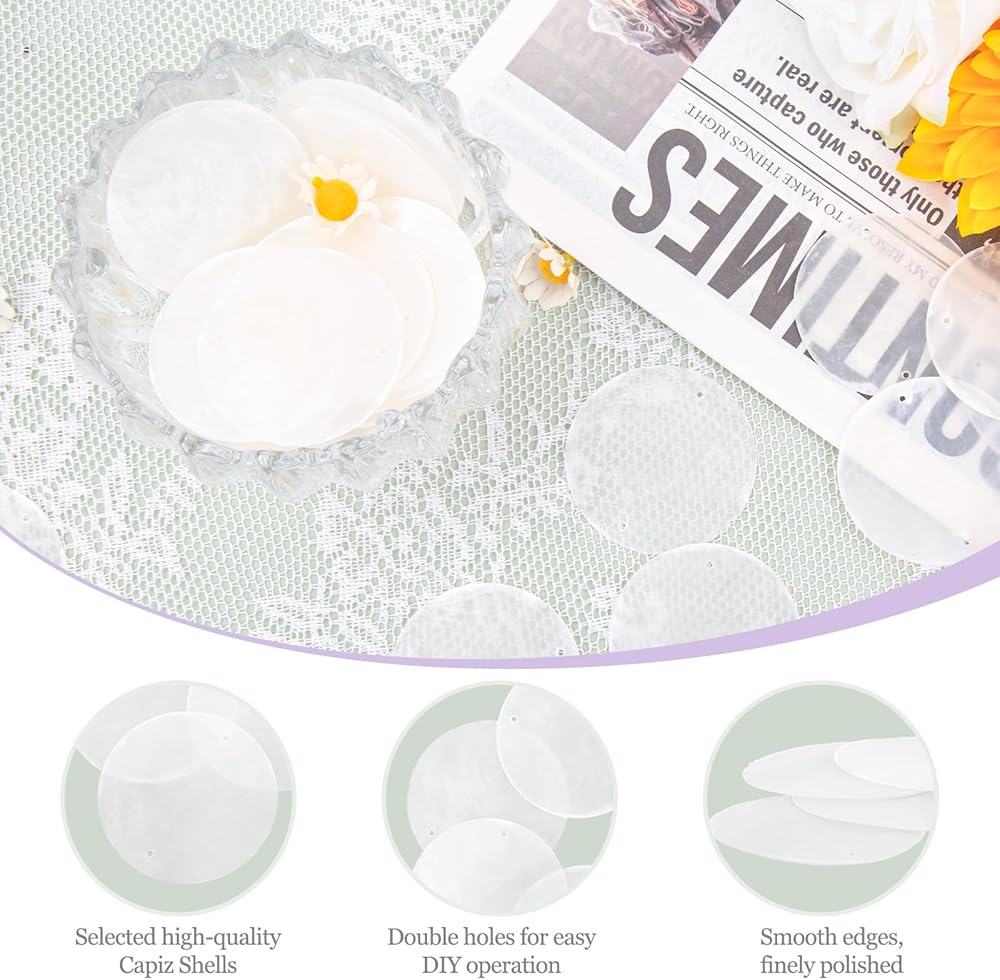 Perfect for DIY & Handmade Crafts: Whether you're designing wind chimes, curtains, chandeliers, jewelry, lampshades, or wedding décor, these Capiz shells are a versatile material that brings natural beauty and elegance to any piece. Their smooth surface and consistent size make them easy to handle for crafters of all levels.
