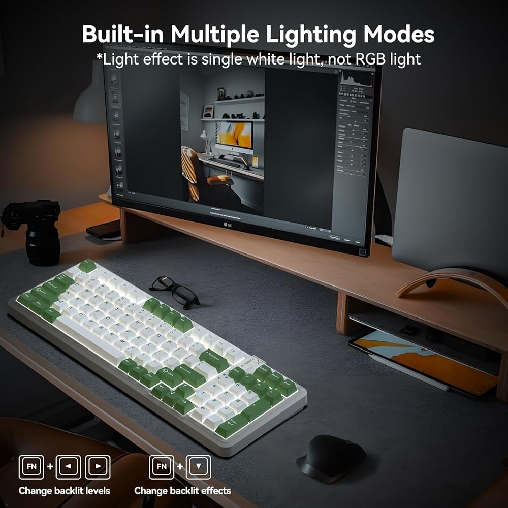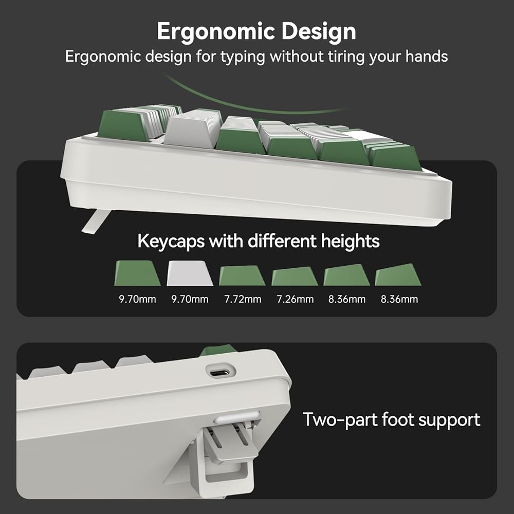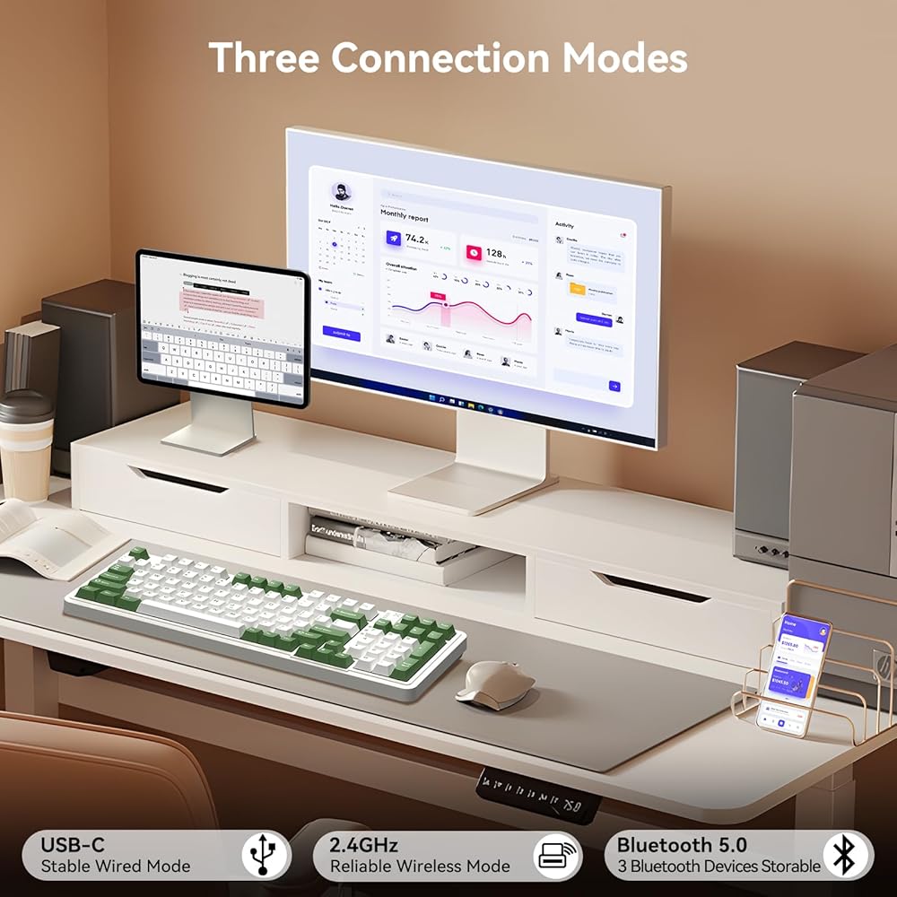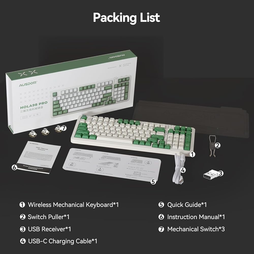 Triple Connection Modes- The AUSDOM 98Pro wireless mechanical keyboard is an exceptional gaming keyboard that provides three connection modes, including Bluetooth 5.0, 2.4GHz wireless connection and USB-C wired mode. It can easily connect up to 5 devices and seamlessly switch among them, very suitable for work, study and casual games