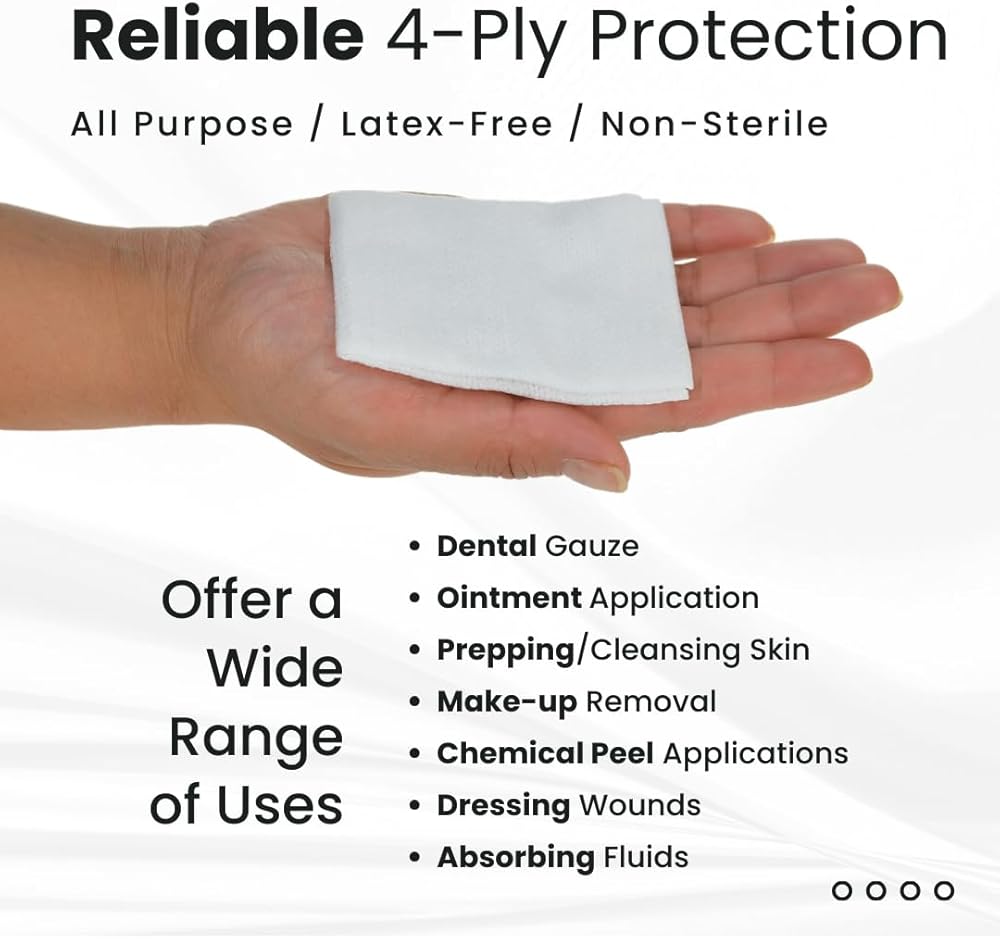 Multi-Purpose Use: Our non-woven sponges offer a wide range of dressing, cleaning, and prepping procedure uses, but not limited to dental gauze, oinment application, prepping/cleansing skin prior to waxing, make-up removal, chemical peel applications, dressing small blisters, and absorbing fluids. They are designed with no exposed raw edges for superior quality. Made of cotton, the sponges provide maximum absorption for ultimate wound care.