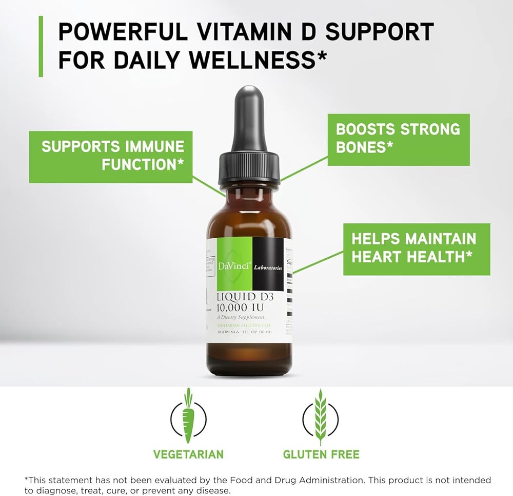 Liquid D3 10,000 IU is a dietary supplement to support the body's absorption of calcium and phosphorous, which are essential for the development and maintenance of healthy teeth and bones. New research suggests that it may support immune system function by supporting healthy cell growth.