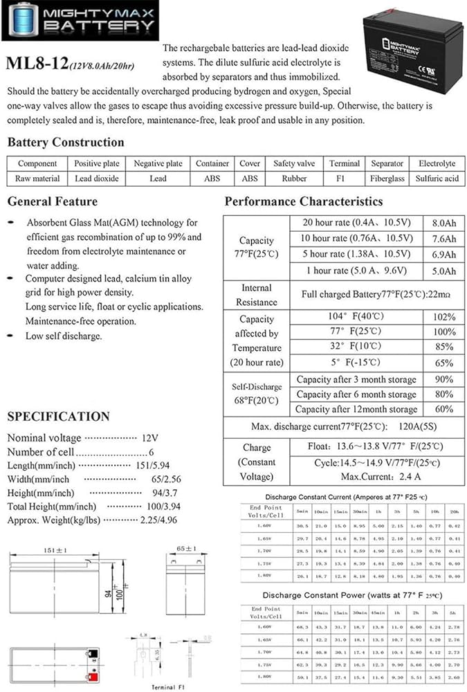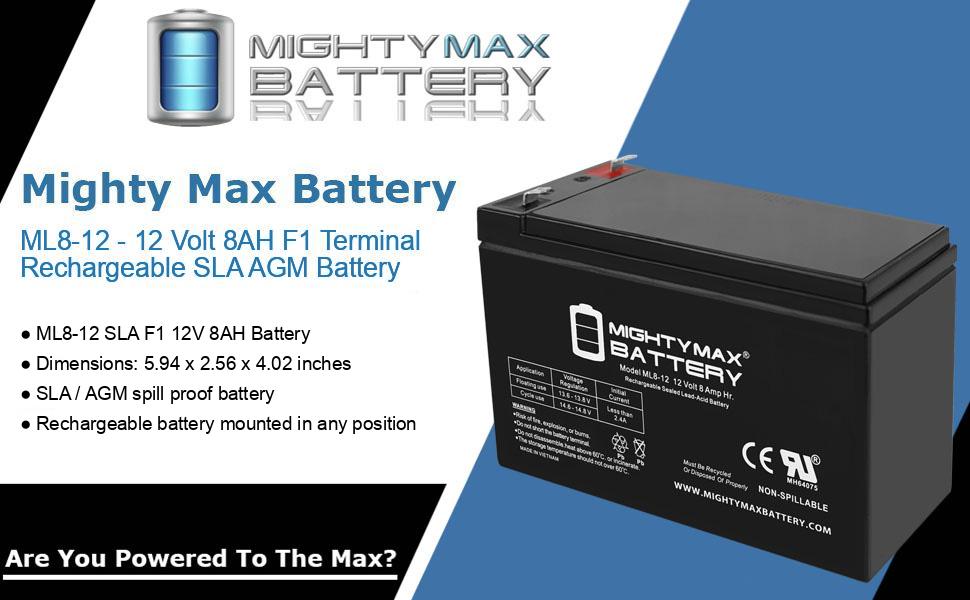 - ML8-12 SLA is a 12V 8AH Sealed Lead Acid (SLA) rechargeable maintenance free battery, Pack of 6 - UL Certified