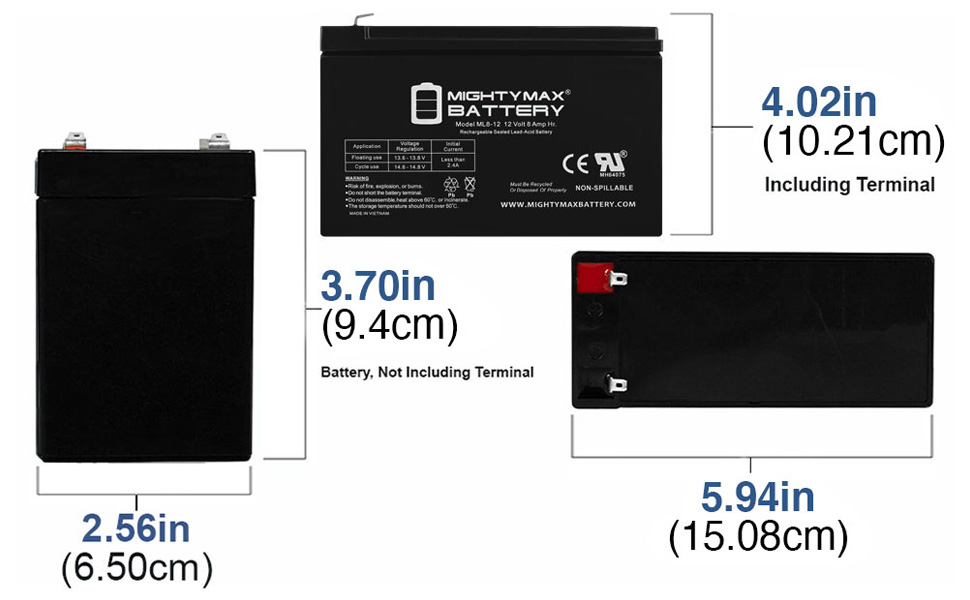 - Dimensions: 5.94 inches x 2.56 inches x 4.02 inches. Terminal: F1. Listing is for the Battery only. No wire harness or mounting accessories included.