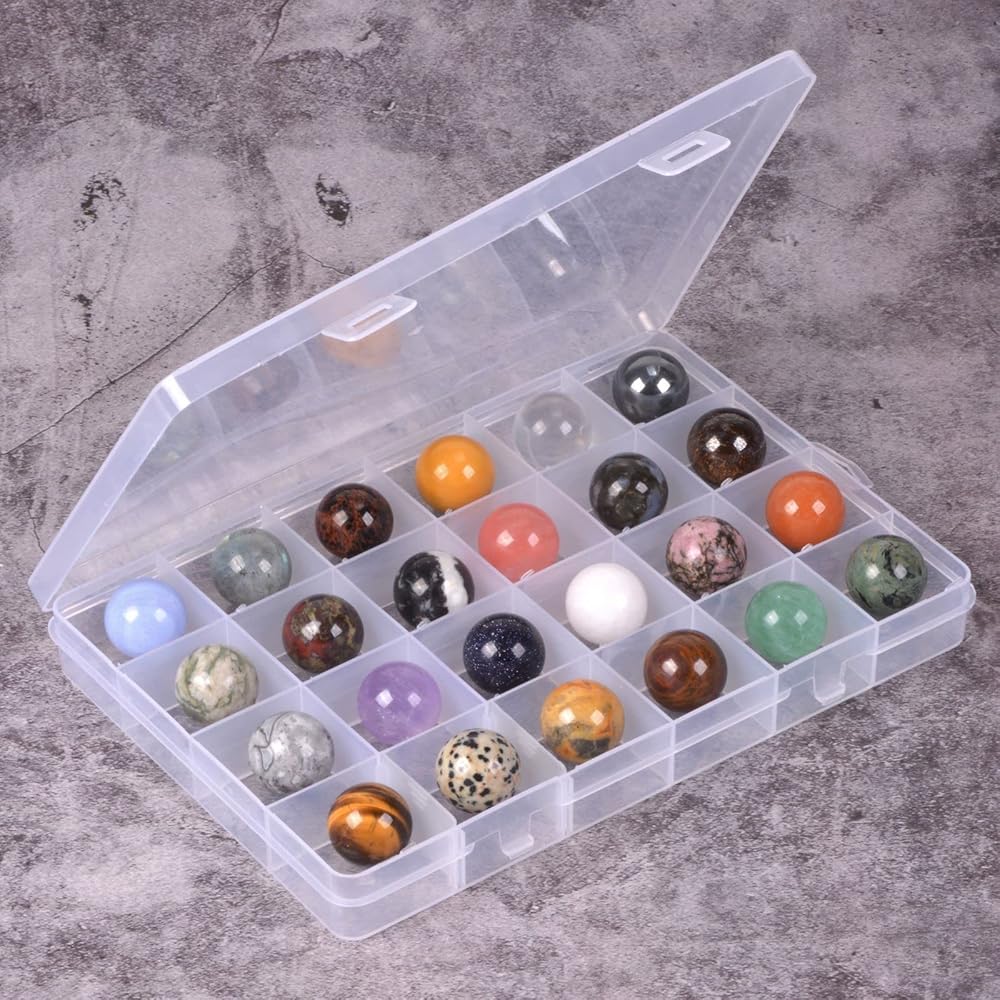 This listing is 24pcs randomly chosen different materials Round Balls.Round Ball Size: approximately 20mm(0.8 inch) diameter(The balls in same set may have slightly different in size, about 19.7mm to 20.1mm).The plastic box will be included, BOX size: 19*13*2.2cm(7.5*5*0.9 inches)