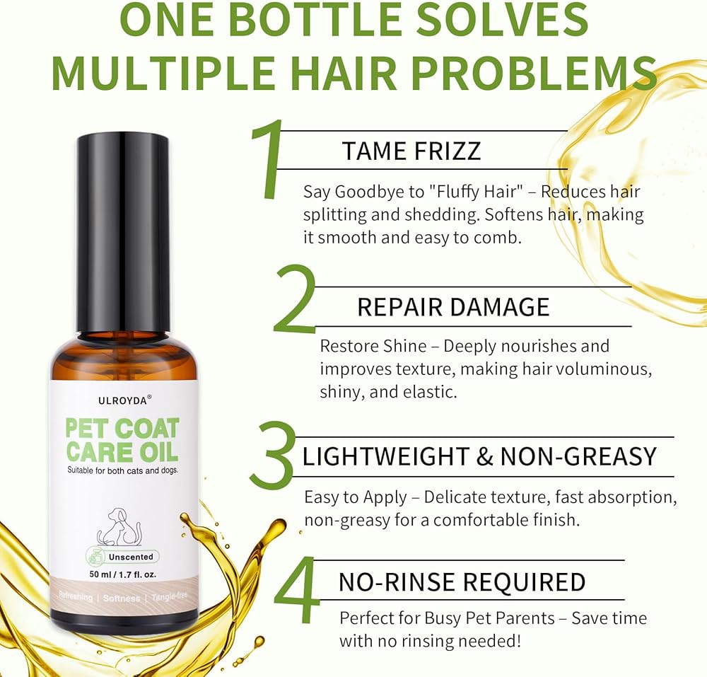 Shiny & Smooth Coat – The grooming oil, infused with Jojoba and Coconut Oils, enhances the natural shine of your pet's fur while adding moisture. It works as a leave-in conditioner, restoring softness and leaving your pet's coat healthy and radiant