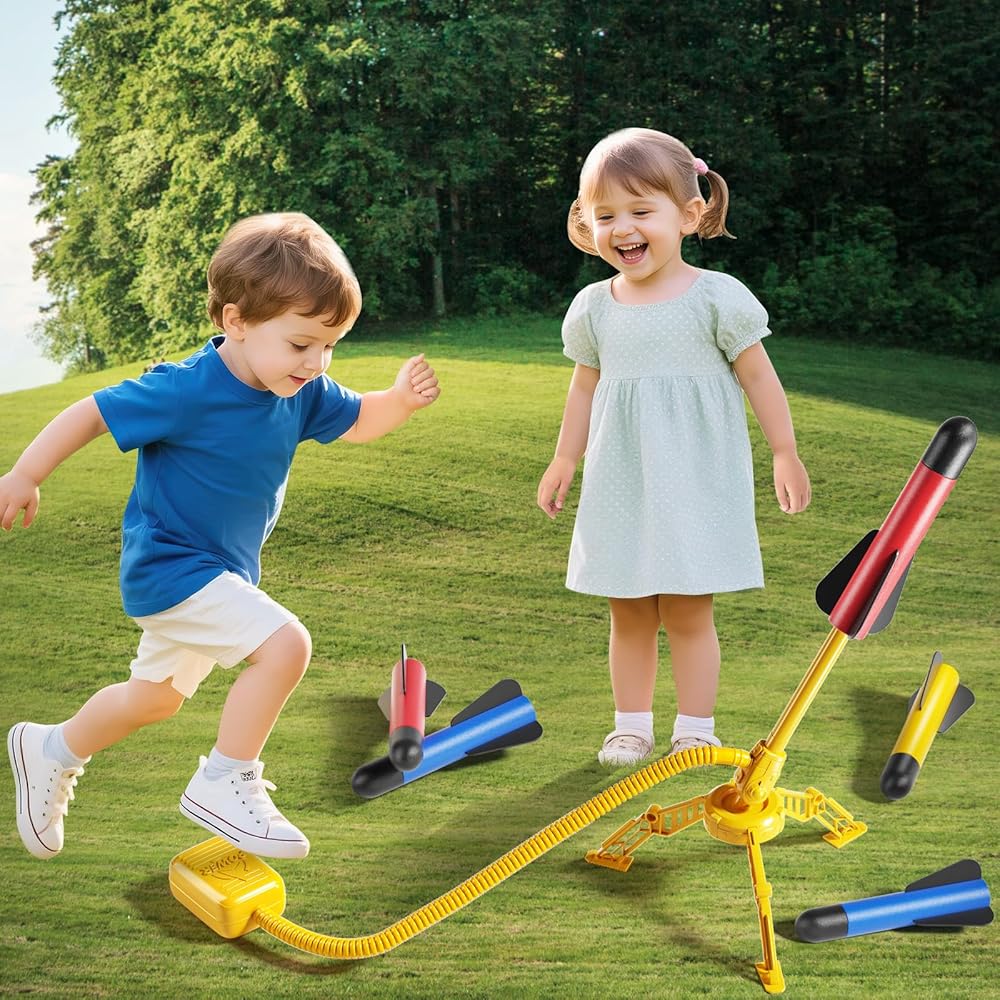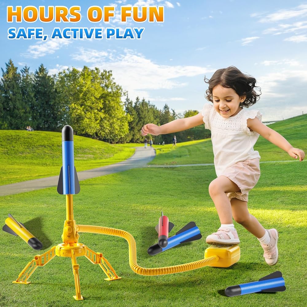 Indoor & Outdoor Sport Game - Children can launch rocket up to 100+ feet into the sky with simple action, distance and height will varying with pedaling force. Perfect for outdoor fun in the backyard, or park. This rocket launcher is an Ideal gift for 3 4 5 6 7 8 9 10 11 12 year old boys and girls.