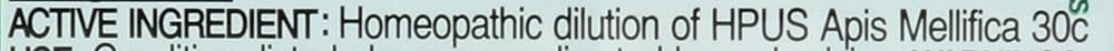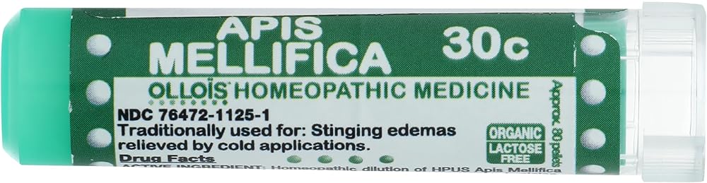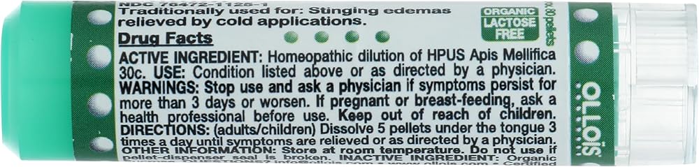 Ollois Organic and Lactose-Free Apis mellifica 30C homeopathic single medicines. Traditionally used to temporarily improve symptoms of stinging edemas relieved by cold. The dosage is not related to the weight and age of the patient. In general, dissolve 5 pellets 3 times a day until symptoms are relieved or as directed by your health care professional. Contains appx. 80 pellets in each tube, each dose should be placed under the tongue of adults and children, or in the cheek of an infant, where they will dissolve. It is preferable to take apart from meals. No side effects, no drug interaction. For informational purposes only, not intended for, and neither should it be taken as a substitute for professional medical advice. Stop use and ask a physician if symptoms persist for more than 3 days or worsen. If pregnant or breast-feeding, ask a health professional before use. Keep out of reach of children. These 'Uses' have not been evaluated by the Food and Drug Administration.