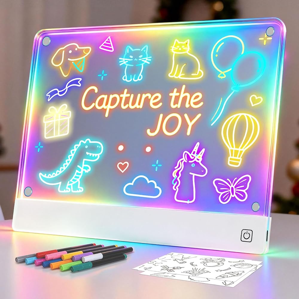 Rechargeable LED Drawing Board for Kids with 7 Colors, Magnetic LED Note Lumi Board with 4 Magnets and Invisible Stand, Light up Acrylic Dry Erase Board Gift Toy for Kids/Girls