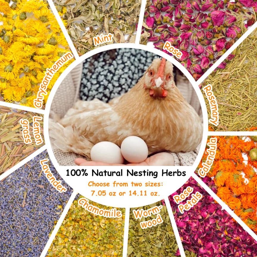 Premium Herbs: Our natural chicken nesting herbs are crafted from a carefully curated blend of 10 premium herbs, available in 7.1 oz (200g) and 14.1 oz (400g) sizes, designed to enhance the comfort and well-being of your chickens.