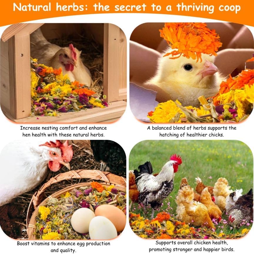 Coop Refresh: The natural herbal aroma of Lavender, Rose, and Lemongrass keeps the air in the chicken coop fresh and pleasant, creating a calm environment for your flock. With nesting herbs perfect for nesting boxes and nesting pads, your hens can relax and lay eggs with ease.