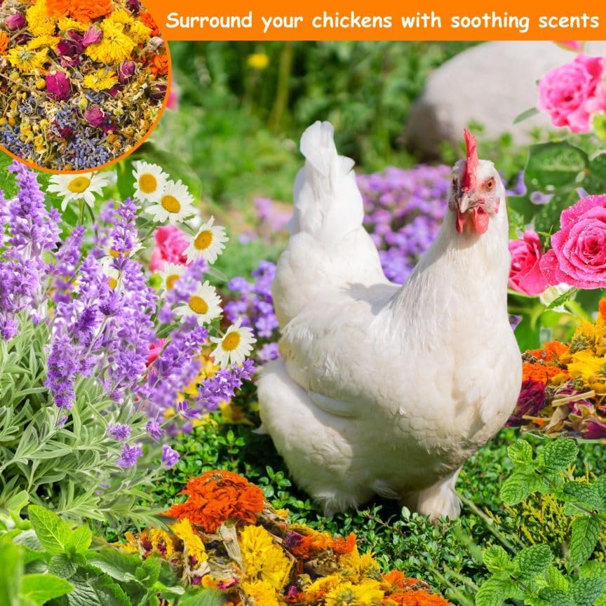 100% Natural and Edible Grade: Our hen feed supplement is a carefully selected blend of Lavender, Rose, Mint, Calendula, Chamomile, Rosemary, Wormwood, Lemongrass, Chrysanthemum, and Cinnamon, each chosen for their benefits in promoting relaxation, digestion, skin health, and overall well-being in chickens.