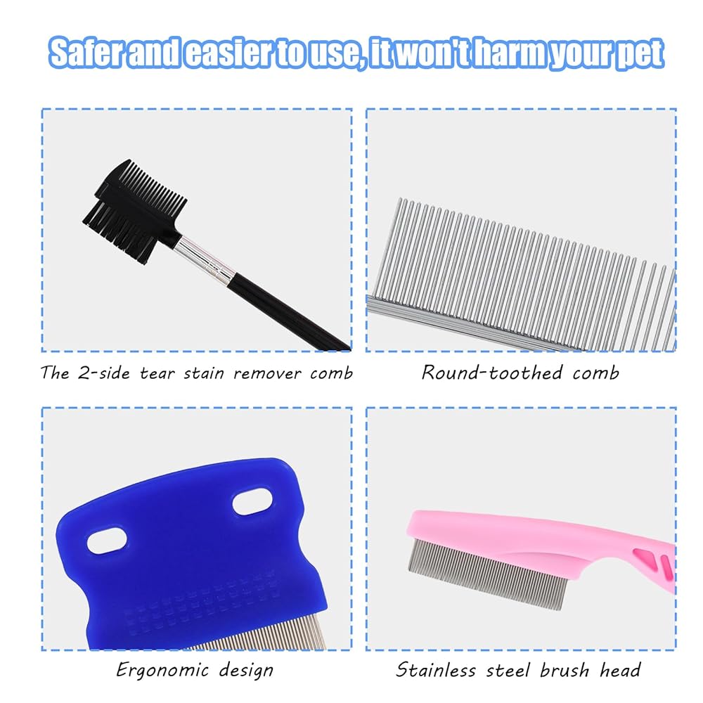 Comprehensive Grooming Kit: Our flea comb for cats and flea comb for dogs set includes 4 combs: a flea comb, a long-handle comb, a double-sided tear stain remover, and a metal grooming comb.