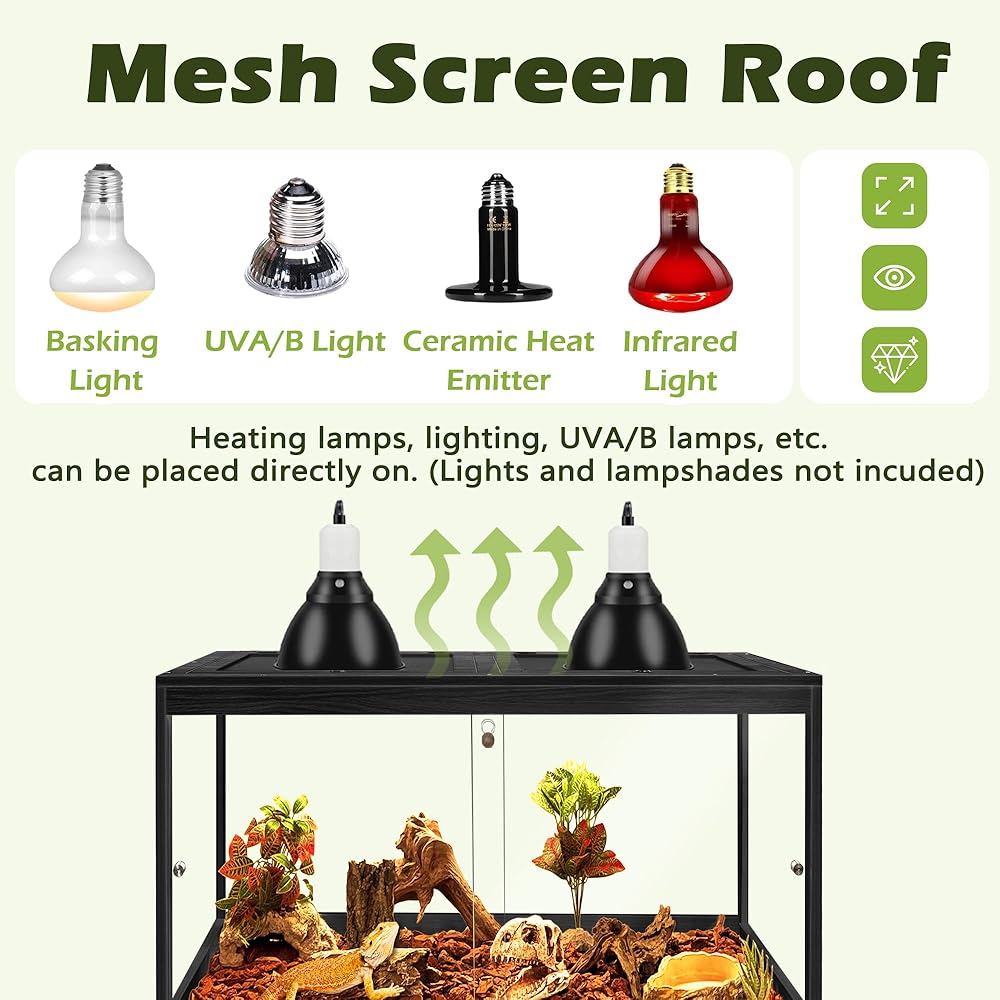 【Smart Design for Comfort & Security】The front features double sliding glass doors with a secure lock for easy access and peace of mind. A sturdy metal mesh top ensures proper ventilation and is compatible with heat lamps or UVA/UVB lighting setups (not included), helping maintain the perfect conditions for your reptiles.