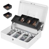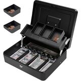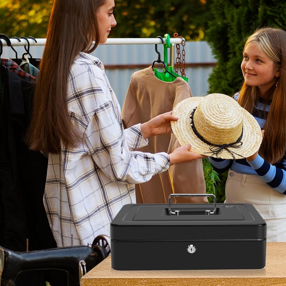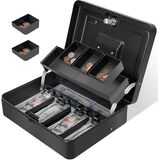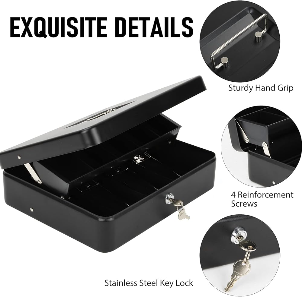 AMPLE SPACE:With dimensions of 11.8"L x 9.5"W x 3.5"H, this portable cash box with 2 keys and money tray provides ample space for storing all your valuable possessions, from important documents to precious jewelry, watches, cellphones, and more.Featuring a convenient carrying handle, this portable cash box with money tray can be easily transported wherever you go.