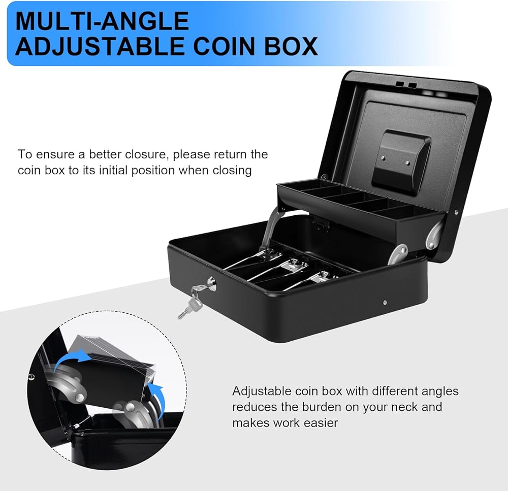 ADJUSTABLE COIN TRAY: Experience the convenience of an adjustable coin tray in this cash box. It can be easily customized to meet your specific needs. Whether you prefer a tilted angle for quick access or a flat position for efficient storage, this versatile coin tray provides enhanced convenience. Arrange your coins as desired, making transactions and counting money effortless. With its adjustable feature, this cash box guarantees a seamless user experience.