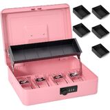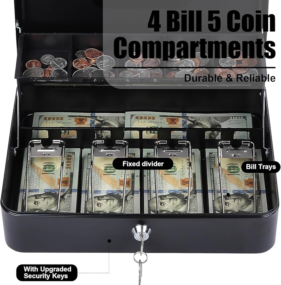 HUMANIZED DESIGN: Tiered tray design allows for full view of entire working area. when this steel cash box with keys be opened five-compartment cantilever coin tray automatically opens for use . Four spring clips at the bottom of locking cash box can make sure sorting and placement of banknotes.