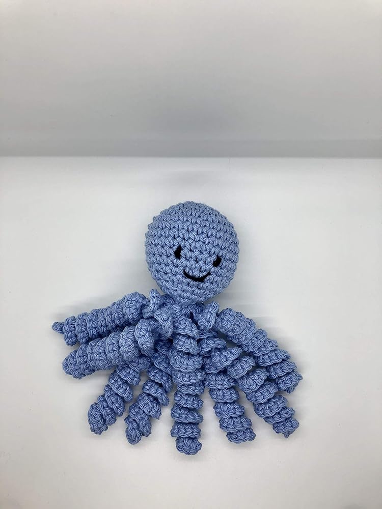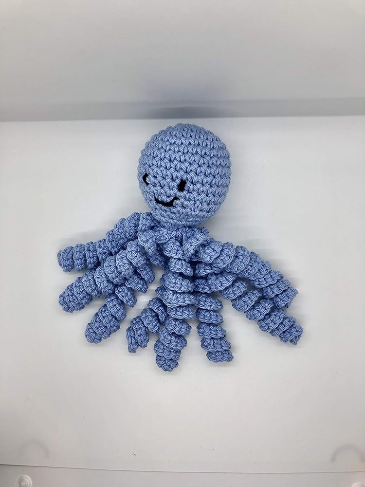Crochet Octopus for Preemies, Crochet Octopus for Babies in Light Blue, is a great and wonderful gift for preemies babies. It's made with 100 percent cotton yarn and filled with polyester fiberfill and the eyes are embroidered (no loose parts hazard). The length is almost 9 inches from a free tobacco smoke home. Preemie babies and babies like octopus because they remember the umbilical cordon and feel comforted. This idea come from Denmark, where a father asked for a crochet octopus for his baby. The nurses noticed that the baby pulled the tentacles instead the tubes, improving his health rapidly. Note: The color variation will vary for each one since is made with multi color yarn. As for the face, I'll replicate as close a possible. It's ready to ship.