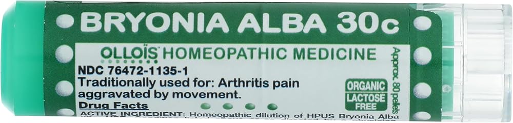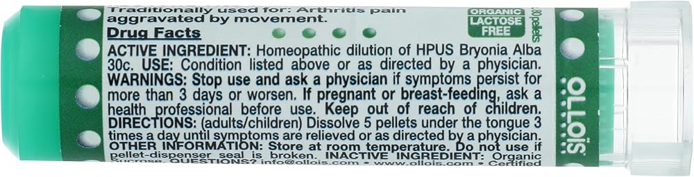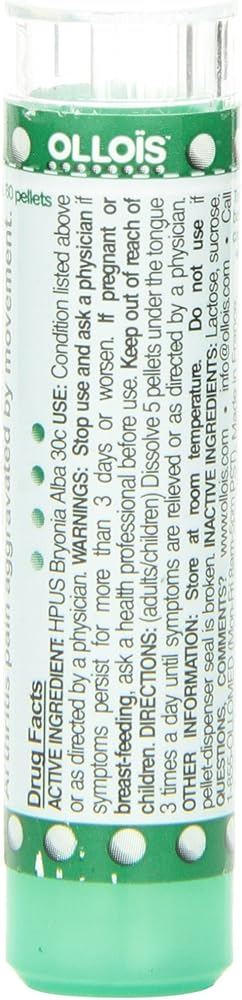 OLLOIS VEGAN Bryonia alba 30C homeopathic single medicine. Traditionally used to temporarily improve symptoms of joint pain aggravated by movement. The dosage is not related to the weight and age of the patient. Dissolve 5 pellets under tongue 3 times a day until symptoms are relieved or as directed by your health care professional. Contains Appx. 80 pellets in each tube, each dose should be placed under the tongue of adults and children, or in the cheek of an infant, where they will dissolve. It is preferable to take apart from meals. No known side effects, No Known drug interaction. For informational purposes only, Not intended for, and neither should it be taken as a substitute for professional medical advice. Stop use and ask a physician if symptoms persist for more than 3 days or worsen. If PREGNANT or breast-feeding, ask a health professional before use. Keep out of reach of children. These 'uses' Have not been evaluated by the Food and Drug Administration.