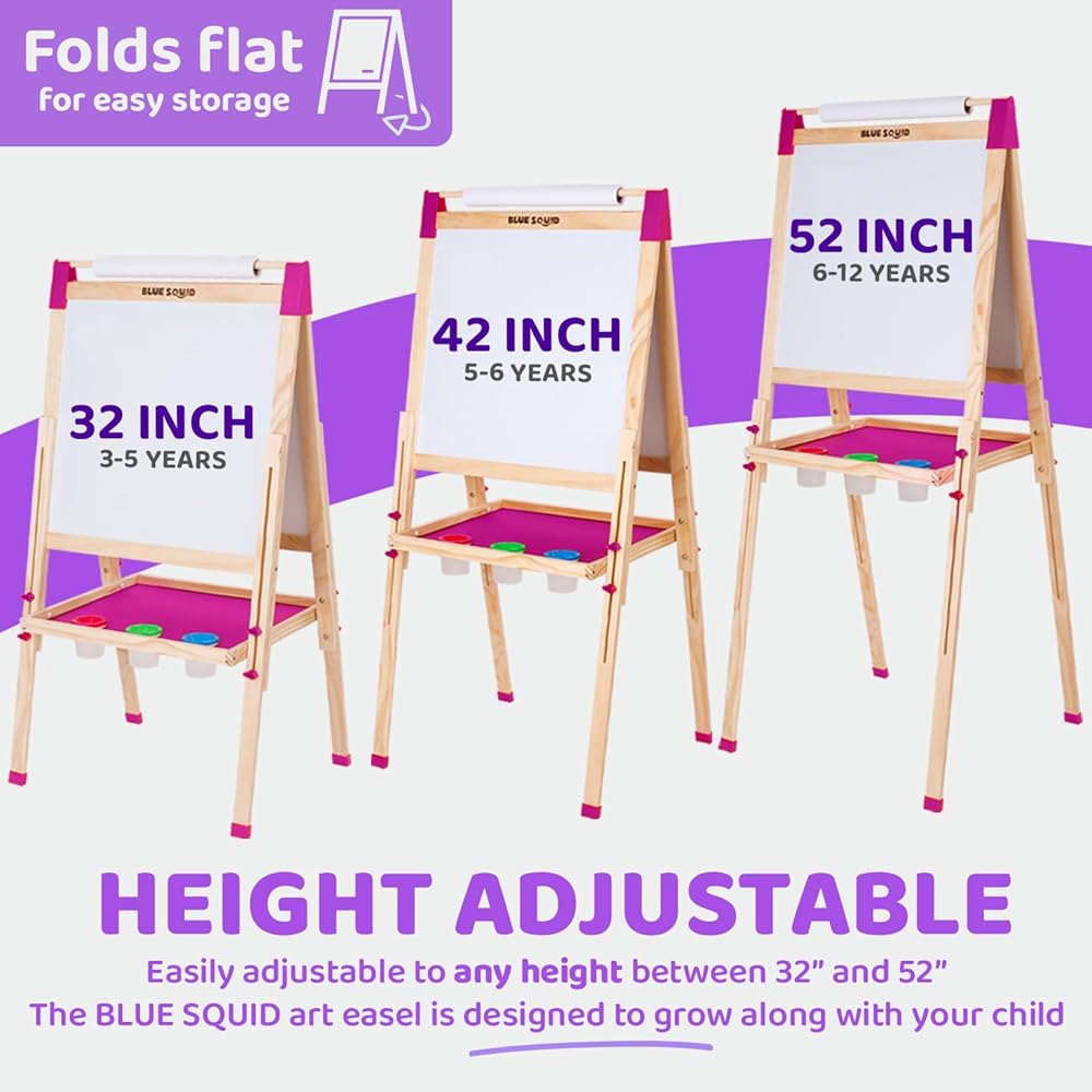 🎨 𝗨𝗟𝗧𝗜𝗠𝗔𝗧𝗘 𝗔𝗥𝗧 𝗦𝗧𝗔𝗧𝗜𝗢𝗡: Blue Squid's 3-in-1 kids art easel for kids 3-4 features a chalkboard on one side and a dry erase board on the other. Both sides are magnetic, securing the pull-down paper in place with the included magnetic buttons, offering hours of fun for painting, practicing ABCs & more! A perfect gift for 3-4 and 4-9 year olds, this fun & educational easel sparks imagination, enhances fine motor skills, and makes learning fun through creative play.
