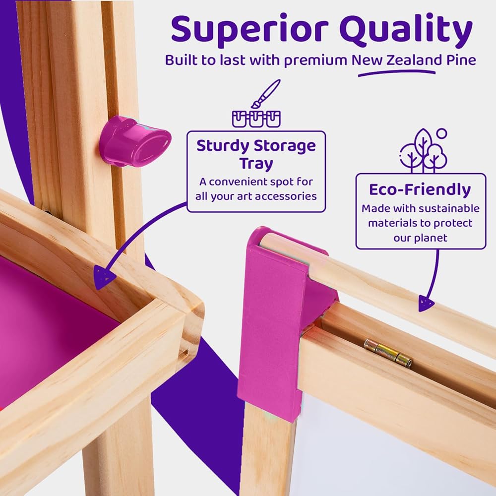 🌟 𝗦𝗧𝗨𝗥𝗗𝗬 & 𝗖𝗛𝗜𝗟𝗗-𝗦𝗔𝗙𝗘 𝗗𝗘𝗦𝗜𝗚𝗡 𝗪𝗜𝗧𝗛 𝗘𝗔𝗦𝗬 𝗖𝗟𝗘𝗔𝗡𝗨𝗣: Our adjustable easel for kids is built with a sturdy structure and easy cleanup, ensuring a safe and enjoyable art space for children. Our kids chalkboard double sided easel is designed for extra sturdiness, making it perfect for hours of creative play.
