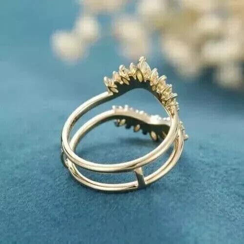 Elevate your wedding ring with the Drizzle Jewels 2Ct Marquise-Cut Lab Created Diamond Wrap Guard Enhancer Wedding Band Ring in 14K Yellow Gold Finish. This stunning enhancer ring features a marquise-cut lab-created diamond weighing an impressive 2 carats, expertly set in a 14K yellow gold finish band. The wrap guard design adds a touch of elegance and sophistication, complementing your existing wedding ring beautifully. With its high-quality craftsmanship and brilliant sparkle, this ring is a luxurious addition to your bridal jewelry collection. Wear it as an enhancer or on its own for a dazzling statement piece. Crafted with precision and care, this ring is sure to become a cherished heirloom.