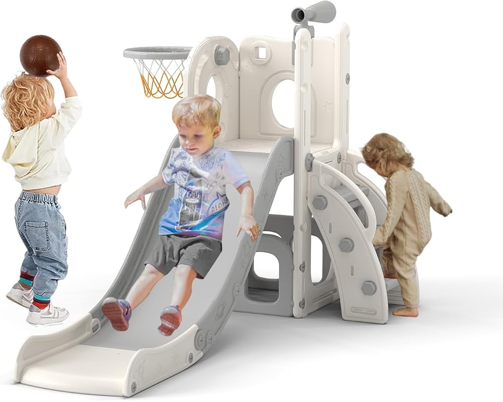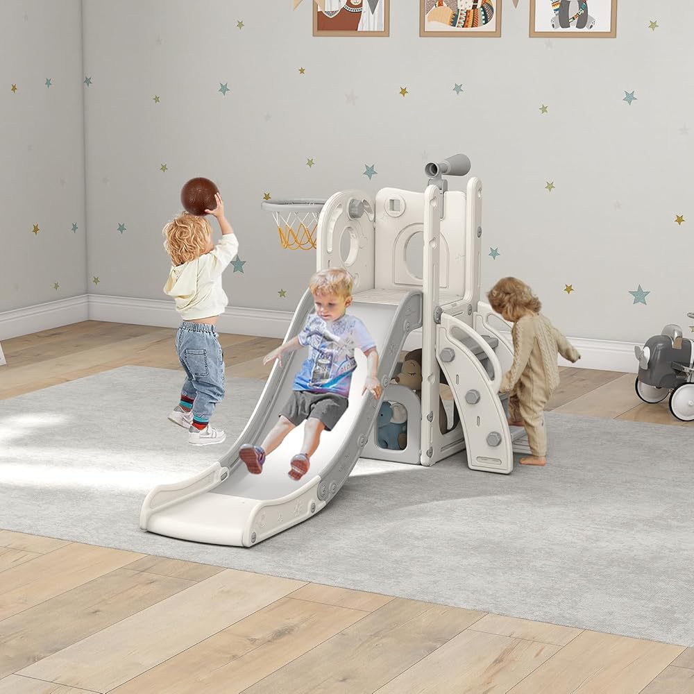 Indoor Playground Fun: This versatile toddler playset is designed to keep your child entertained for hours while promoting physical and cognitive development. With an extended slide, a swing, a telescope, a basketball hoop with a ball, and two storage areas, this indoor slide for toddlers ages 6 months+ is packed with fun features to engage their imagination and enhance their motor skills.