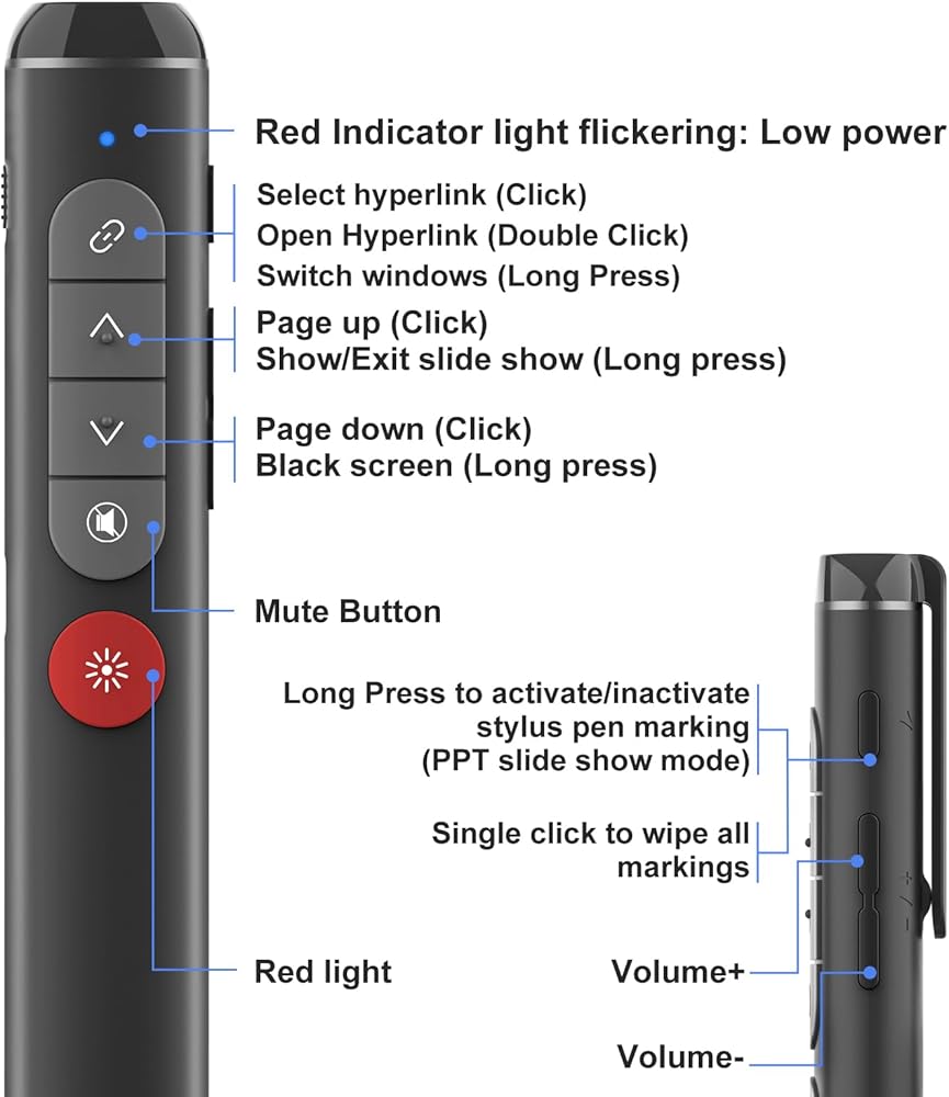 [وظائف النزهة عن العرض التقديمي] قم بتشغيل/إيقاف تشغيل التبديل ، زر العلامات (اضغط منذ فترة طويلة لتنشيط/تعطيل وظيفة وضع علامة القلم القلم ، انقر واحد إلى مسح جميع العلامات) ، زر علامة التبويب (نقرة واحدة → علامة التبويب/حدد الارتباط التشعبي ، انقر نقرًا مزدوجًا → إدخال/أو فتح الارتباط التشعبي , اضغط على Windows) زر الصوت ، زر ليزر أخضر