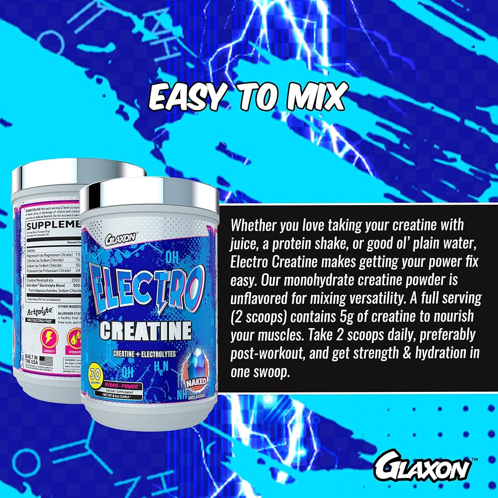 EASY TO MIX: Whether you love taking your creatine with juice, a protein shake, or good ol' plain water, Electro Creatine makes getting your power fix easy. Our monohydrate creatine powder is unflavored for mixing versatility. A full serving (2 scoops) contains 5g of creatine to nourish your muscles. Take 2 scoops daily, preferably post-workout, and get strength & hydration in one swoop.