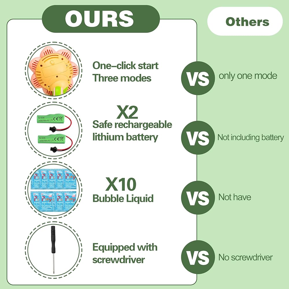 🎯 2. One-Button Auto-Swing for Tiny Hands Specially designed non-slip rubber grip + oversized button lets even 3-year-olds control bubble storms单手! Auto head-swings spray bubbles 360° and auto-shutoff protects machine if dropped – no more crying over spills!
